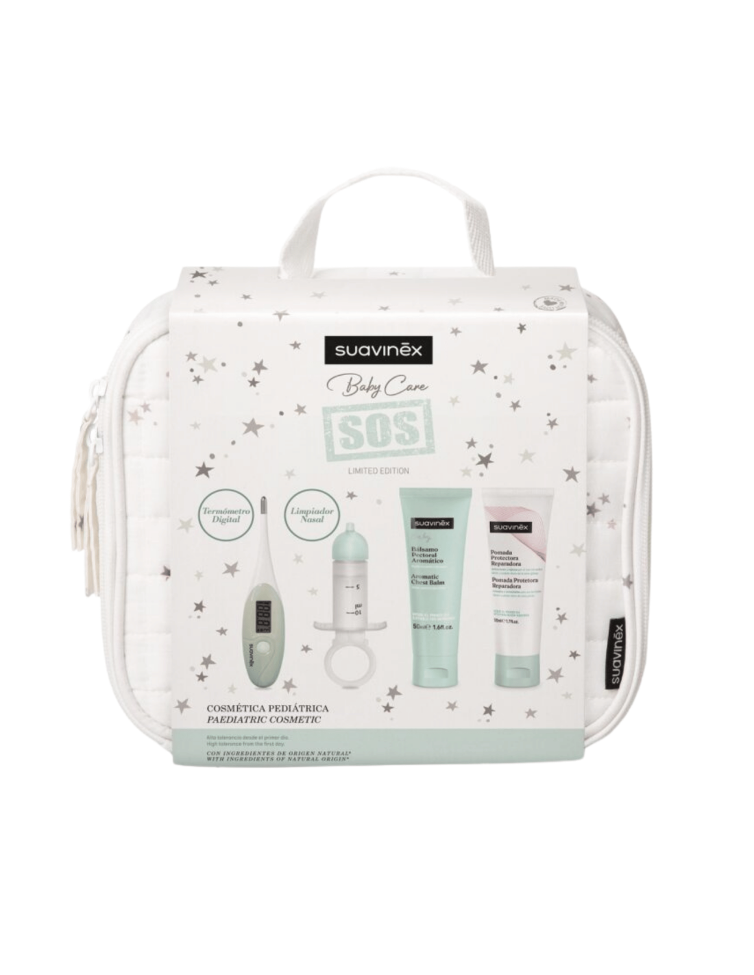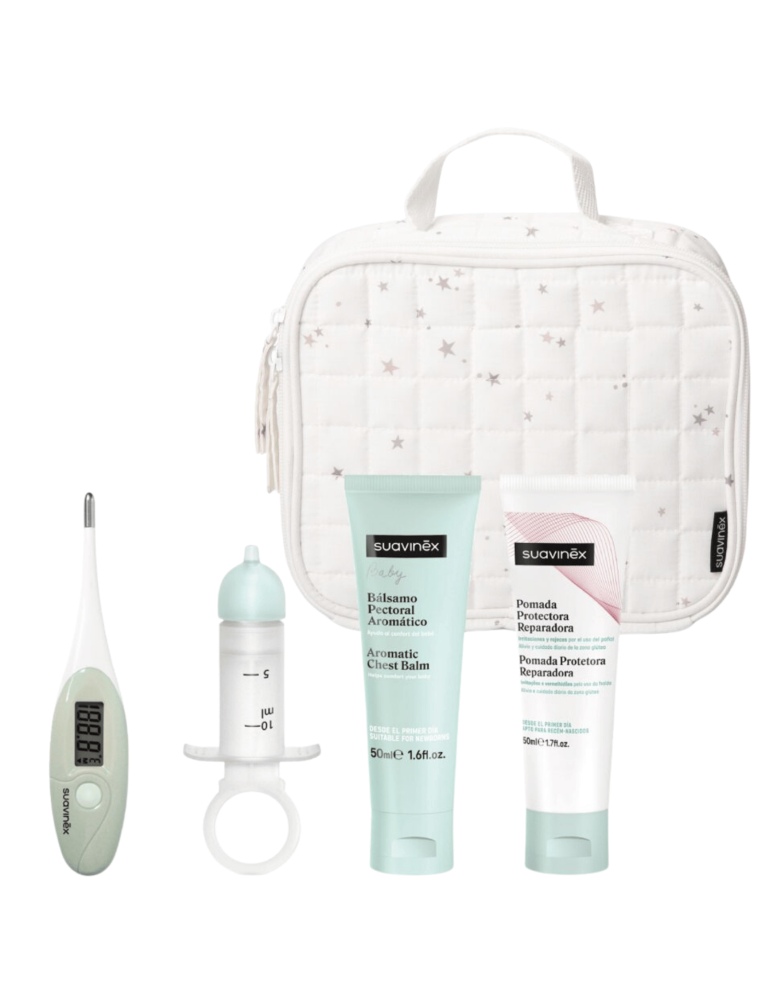 La Canastilla Bebé Blanco Suavinex es un completo set de cuidado pensado para acompañar al bebé desde sus primeros días. Reúne productos esenciales de higiene, salud y bienestar, presentados en una elegante canastilla de color blanco, ideal también como regalo para recién nacidos. Incluye un termómetro digital para el control rápido y preciso de la temperatura, un limpiador nasal para mantener despejadas las vías respiratorias, un bálsamo pectoral que aporta sensación de confort en épocas de congestión y una pomada para el pañal que ayuda a proteger la piel frente a rojeces e irritaciones. Todos los productos han sido formulados y diseñados teniendo en cuenta la piel sensible del bebé, ofreciendo seguridad, eficacia y facilidad de uso en el día a día.