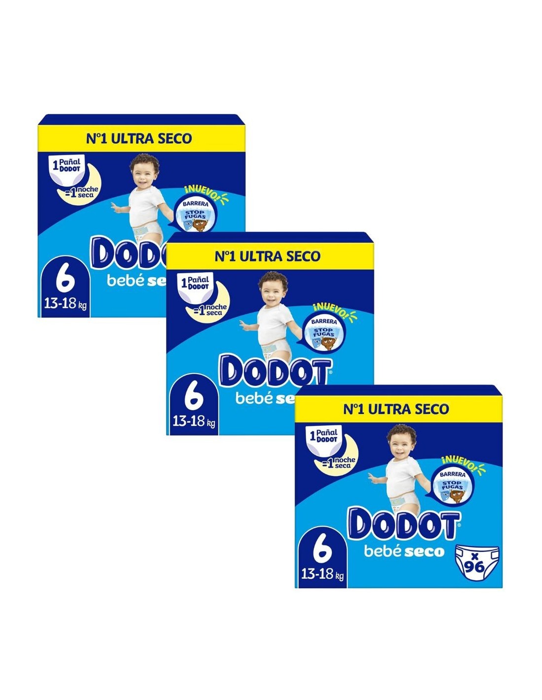 Pack de 288 pañales Dodot Bebé‑Seco Talla 6, diseñados para ofrecer comodidad y sequedad durante largas jornadas.Gracias a su tecnología Extra Seco, mantienen la piel seca hasta 12 horas, ideal para siestas o salidas prolongadas.
