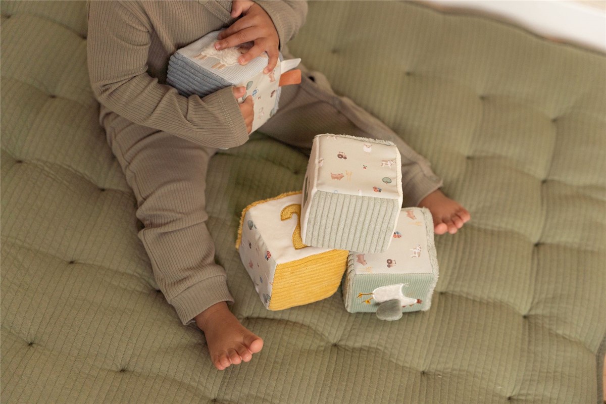 Los cubos blanditos apilables de la colección Pequeña Granja de Little Dutch ofrecen a los bebés múltiples posibilidades de juego y aprendizaje desde los primeros meses. Cada cubo incluye sorpresas sensoriales como etiquetas, espejito seguro, papel crujiente, sonajero o texturas variadas, además de ilustraciones con simpáticos animalitos de granja. Gracias a su formato blando y ligero, son fáciles de agarrar y apilar, favoreciendo la coordinación mano-ojo, la motricidad fina y la estimulación temprana.