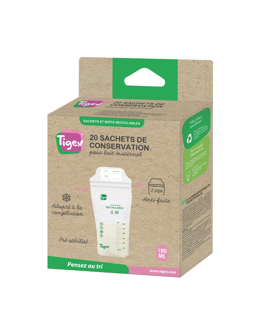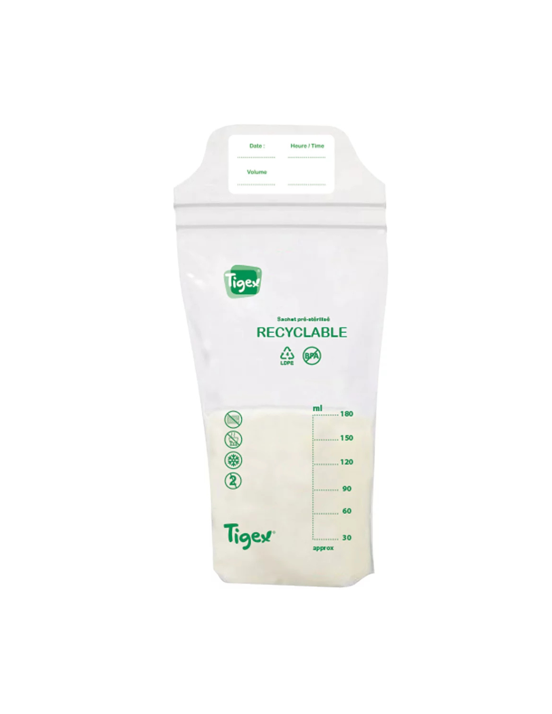 Las Bolsas de Lactancia Eco Tigex 180 ml (pack de 20 unidades) están diseñadas para conservar de forma segura la leche materna y facilitar su organización en el frigorífico o congelador. Fabricadas en material de uso alimentario libre de BPA y BPS, cuentan con doble cierre zip antigoteo, costuras selladas y base expandible que permite mantenerlas en posición vertical para un llenado estable y un almacenamiento eficiente.