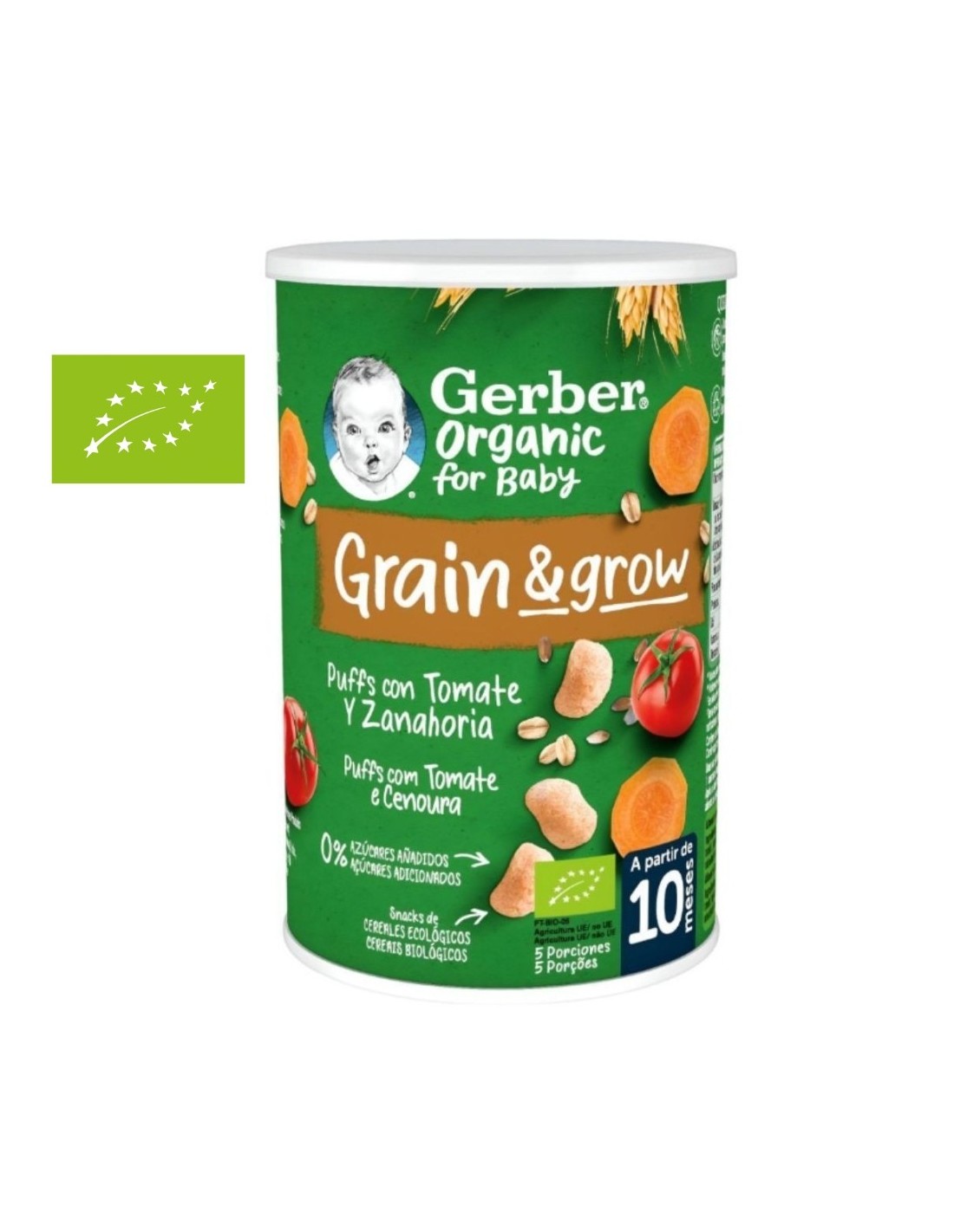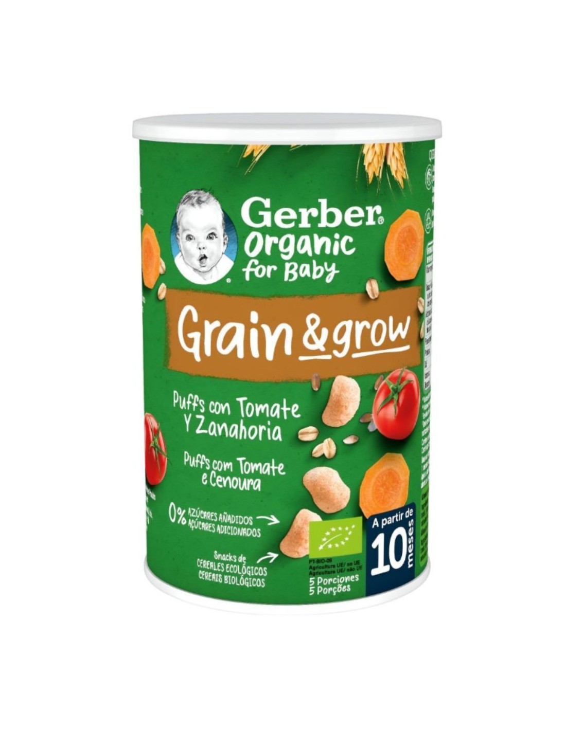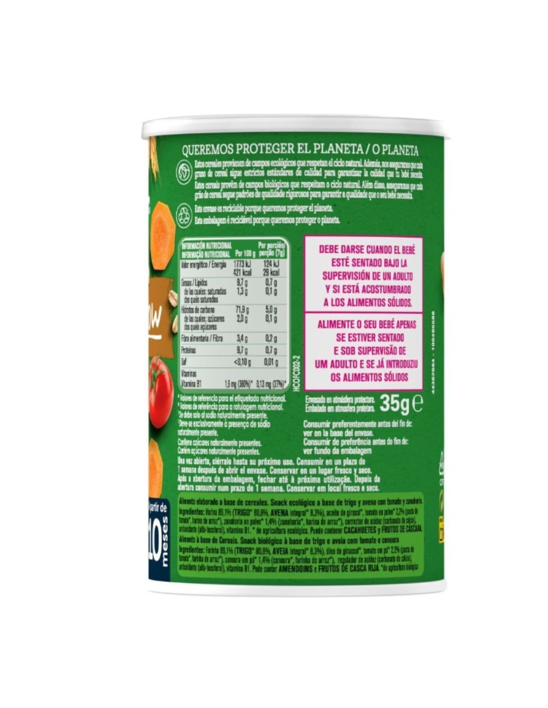 Elaborado con ingredientes 100 % ecológicos, combina cereales integrales con el sabor natural del tomate, aportando un toque suave y delicioso sin necesidad de azúcares añadidos. Un snack ideal para entre comidas, en casa o durante los paseos, con la garantía de calidad de Gerber, marca experta en nutrición infantil.