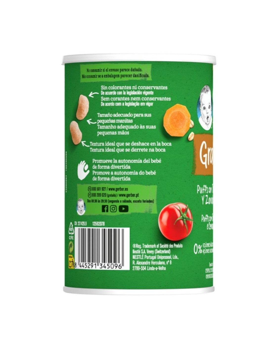 El Puff Snack Orgánico de Cereales con Tomate Gerber ofrece una forma divertida, segura y saludable de acompañar los primeros pasos del bebé en la alimentación sólida. A partir de los 8 meses, su textura ligera y aireada se deshace fácilmente en la boca, ayudando a desarrollar la coordinación mano-boca y los primeros mordisquitos.