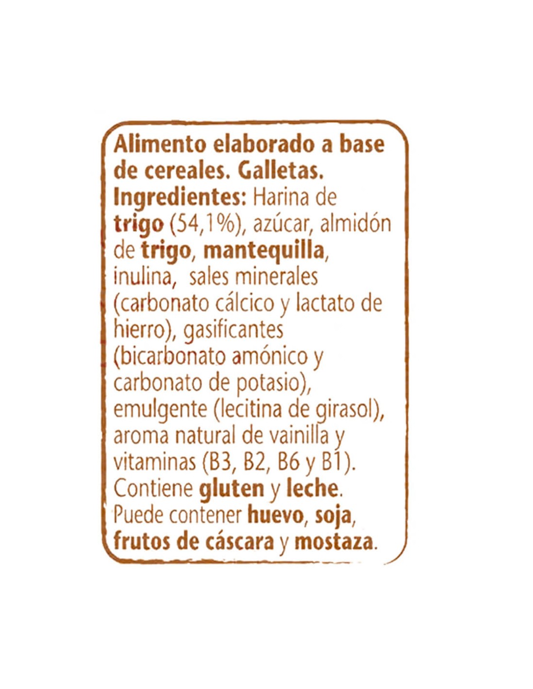 Harina de trigo, azúcar, aceites vegetales (girasol, colza), jarabe de glucosa, minerales (carbonato de calcio, sulfato ferroso), gasificantes (carbonato amónico, carbonato sódico), sal, vitaminas (B1, B2, B6). Contiene gluten. Puede contener trazas de leche, huevo y soja. Sin colorantes ni conservantes.