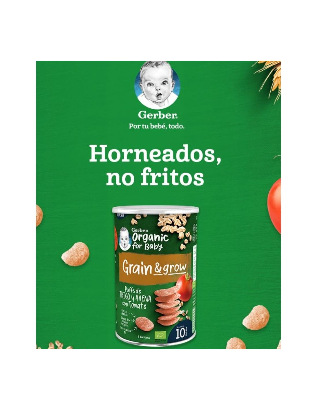 Elaborado con ingredientes 100 % ecológicos, combina cereales integrales con el sabor natural del tomate, aportando un toque suave y delicioso sin necesidad de azúcares añadidos. Un snack ideal para entre comidas, en casa o durante los paseos, con la garantía de calidad de Gerber, marca experta en nutrición infantil.