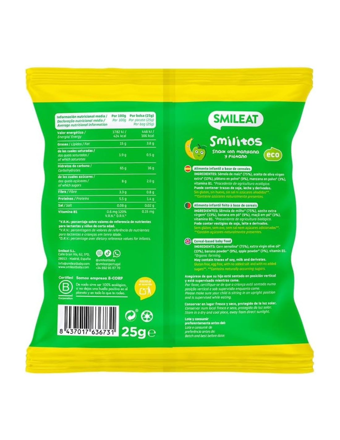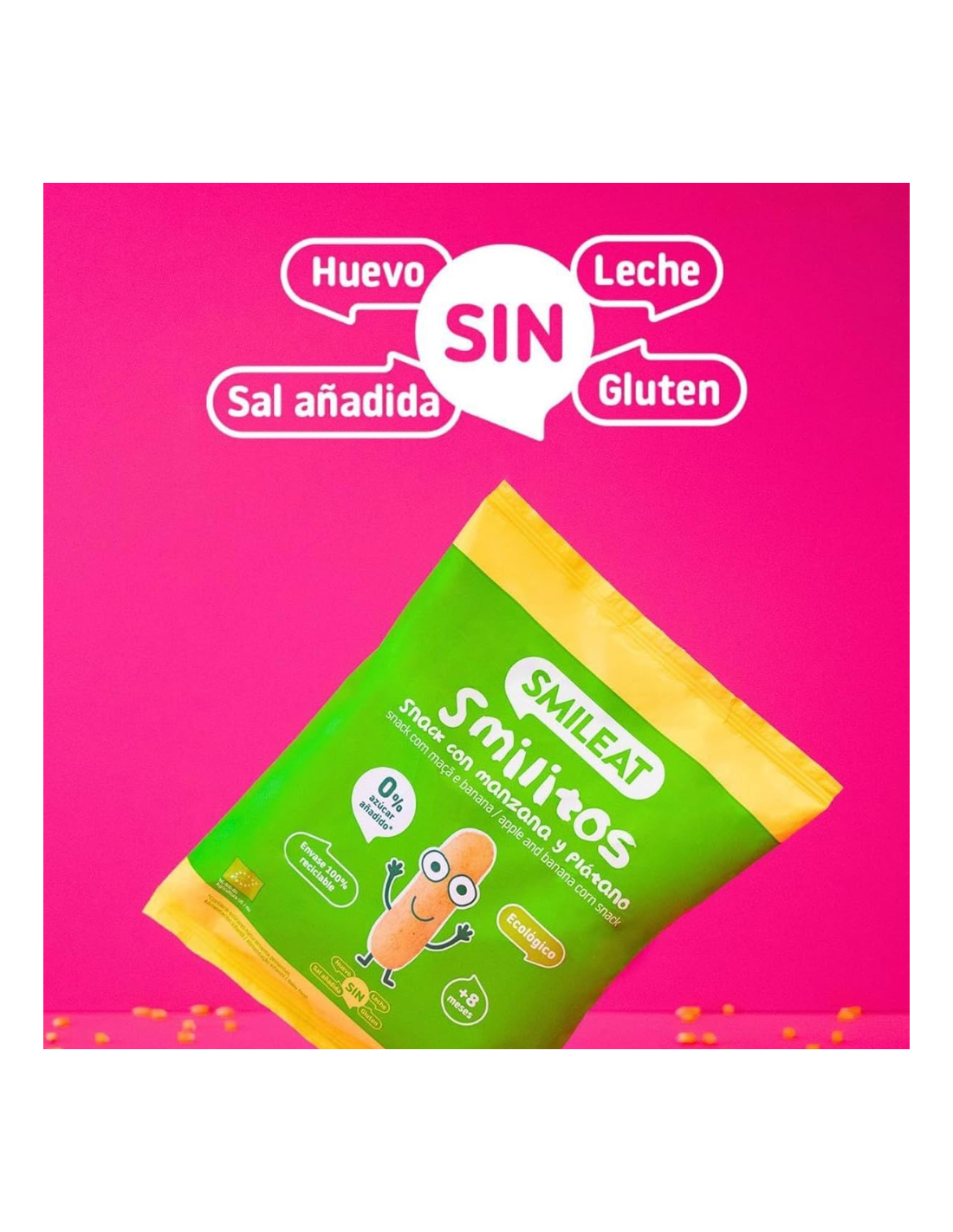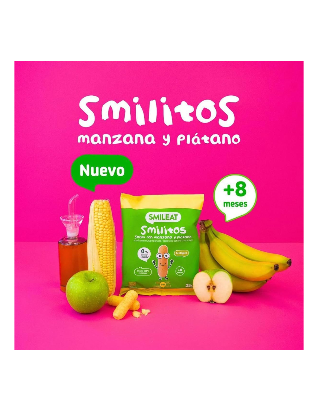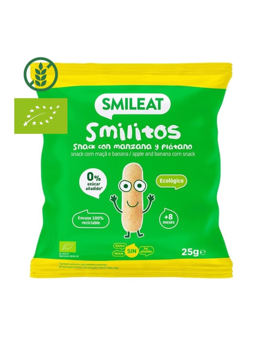 Estos gusanitos ecológicos están elaborados únicamente con maíz orgánico , que se tuesta sin utilizar aceites, lo que los hace ligeros y fáciles de digerir . Gracias al toque de manzana y plátano , tienen un sabor suave y natural que encanta a los más pequeños. Su textura crujiente y ligera ayuda a que el bebé aprenda a masticar, promoviendo su autonomía en la alimentación. Además, los Smilitos Smileat son sin gluten, sin lácteos y sin huevo, lo que los hace aptos para niños con alergias o intolerancias alimentarias.