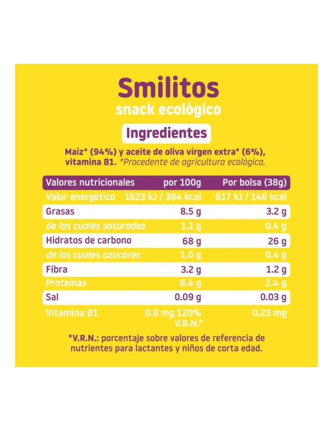 Los Smilitos de Maíz - Smileat están elaborados con maíz ecológico y aceite de oliva virgen extra , sin aditivos ni ingredientes artificiales, asegurando un snack saludable y nutritivo. Su textura ligera y crujiente permite que se disuelvan fácilmente en la boca, evitando riesgos de atragantamiento y facilitando el agarre para el bebé.
