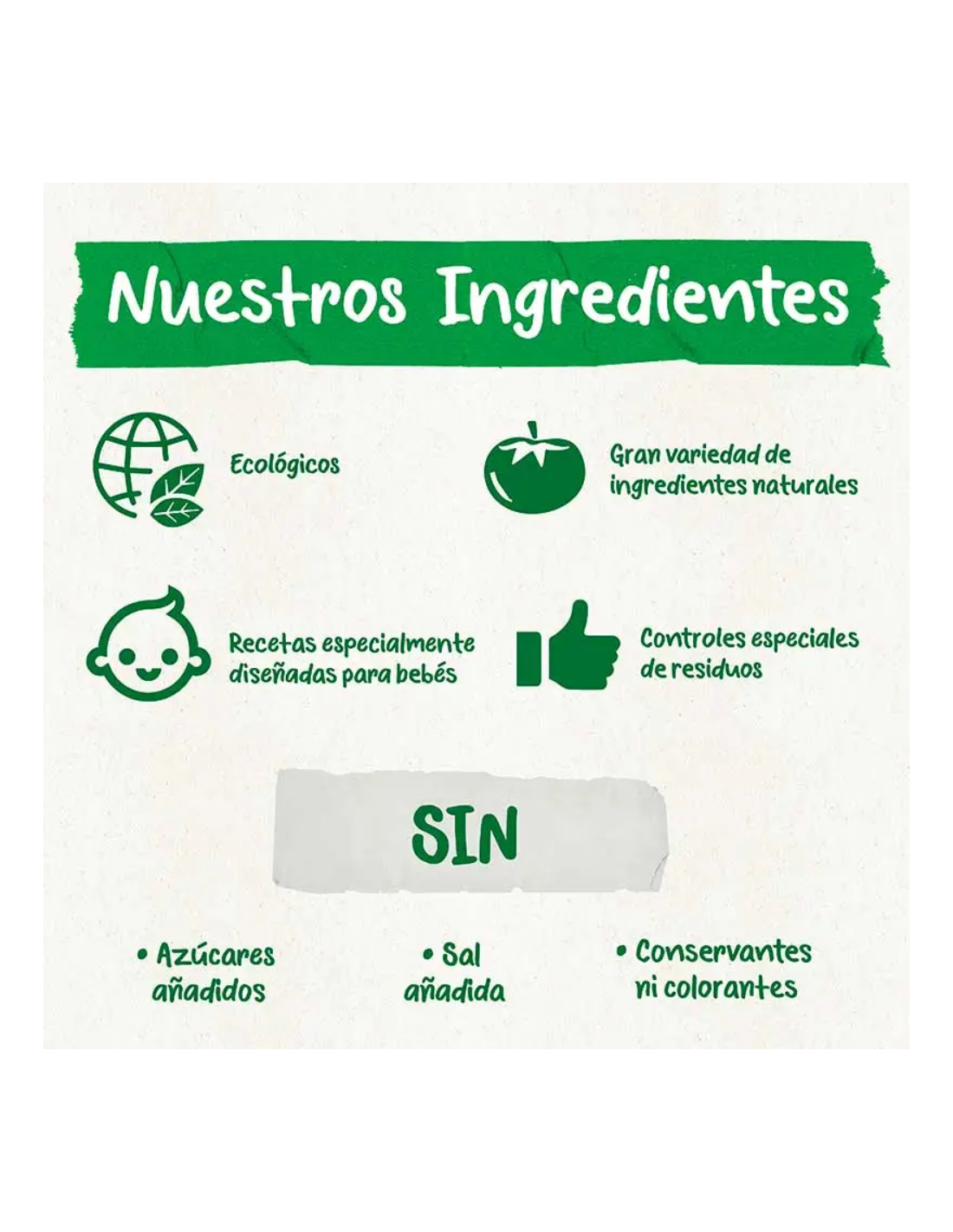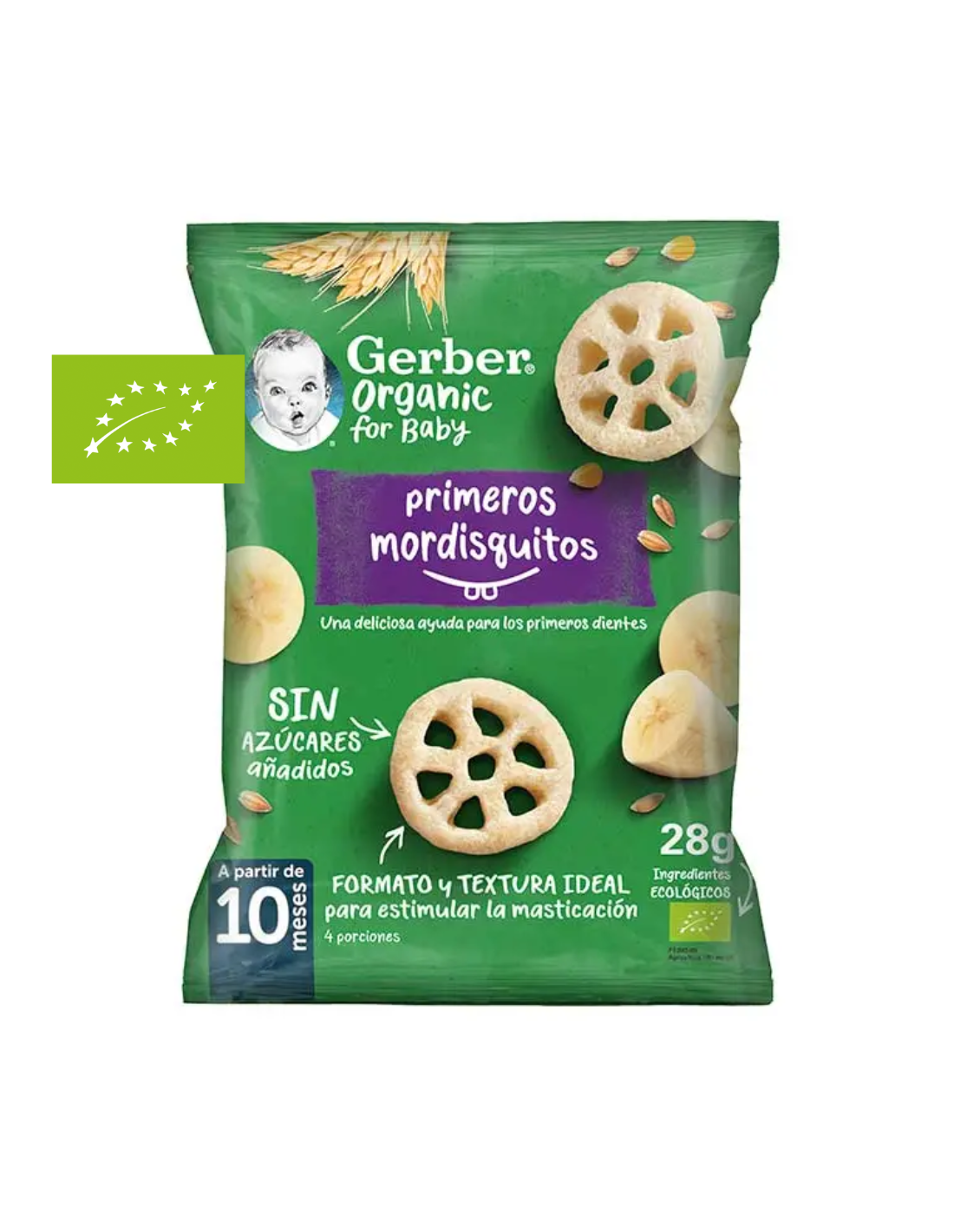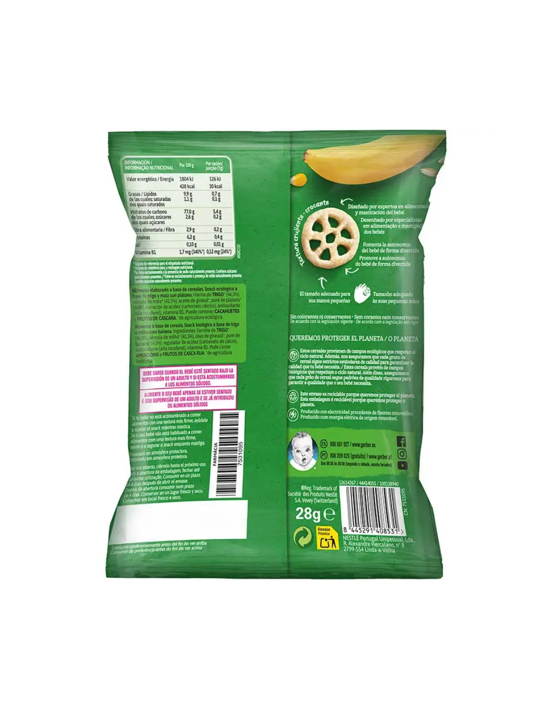 Este snack para bebés está elaborado con cereales ecológicos como el trigo y el maíz, junto con plátano como toque natural de sabor. Su textura ligera y disoluble es perfecta para los primeros mordiscos, ya que se deshace en la boca sin necesidad de masticar demasiado. Es un producto horneado, no frito, sin sal ni azúcares añadidos, y sin colorantes ni conservantes, respetando al máximo la pureza de los ingredientes. Su formato práctico y resellable lo hace ideal para llevar y ofrecer entre comidas, fomentando la alimentación autónoma desde los 10 meses.