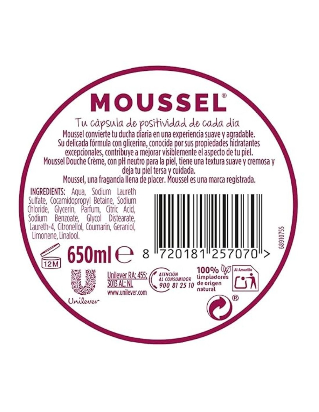 El Gel de baño cremoso Moussel 650ml ofrece una experiencia de higiene única gracias a su fórmula cremosa y aroma inconfundible. Limpia suavemente la piel mientras aporta hidratación y frescor, dejando una sensación de suavidad y bienestar tras cada uso. Su textura rica y espumosa convierte la ducha en un momento de placer diario, siendo ideal para el cuidado de toda la familia.