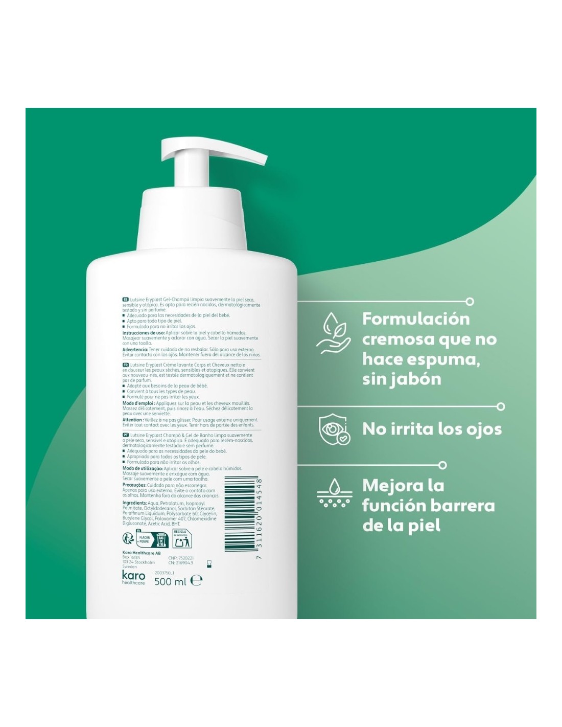 Limpieza suave: Limpia piel y cabello sin resecar ni agredir. Hidratación diaria: Su fórmula emoliente ayuda a restaurar la barrera cutánea. Efecto calmante: Reduce la tirantez y el picor en pieles sensibles y atópicas. Fórmula sin perfume: Minimiza el riesgo de alergias e irritaciones. Textura cremosa: Espuma ligera que se aclara fácilmente. Formato familiar: Envase de 500 ml con dosificador. Dermatológicamente testado: Seguro incluso en bebés desde recién nacidos.