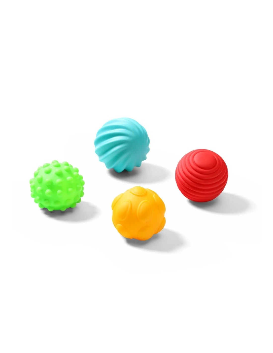 Pack de 4 pelotas con formas, colores y texturas variadas.