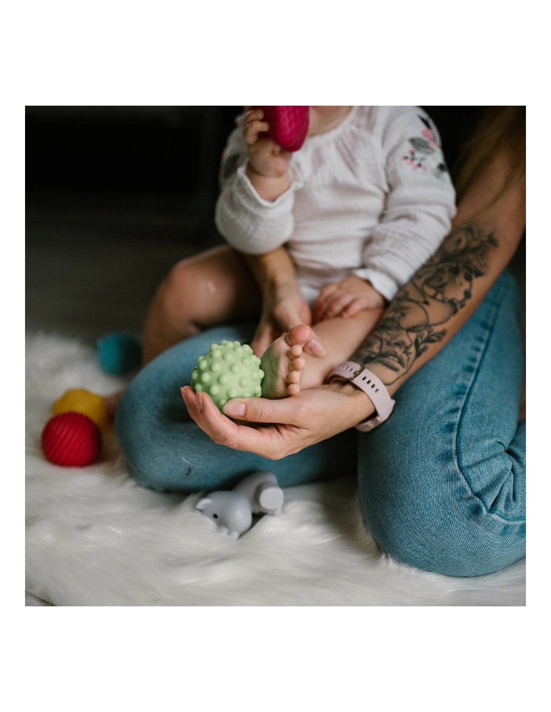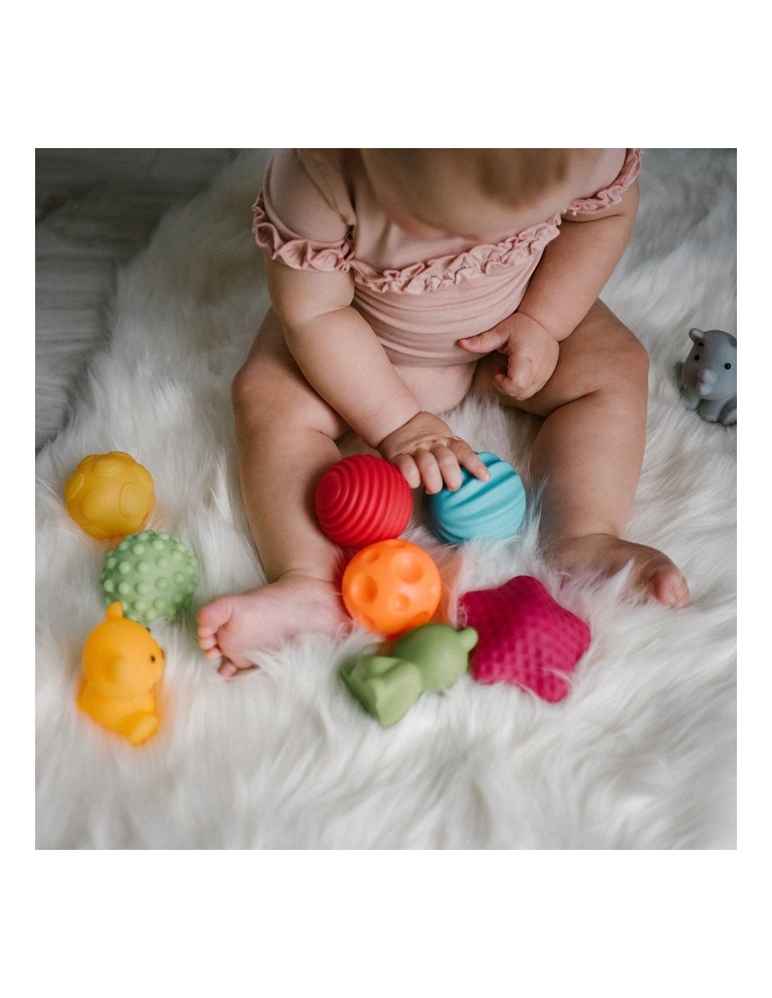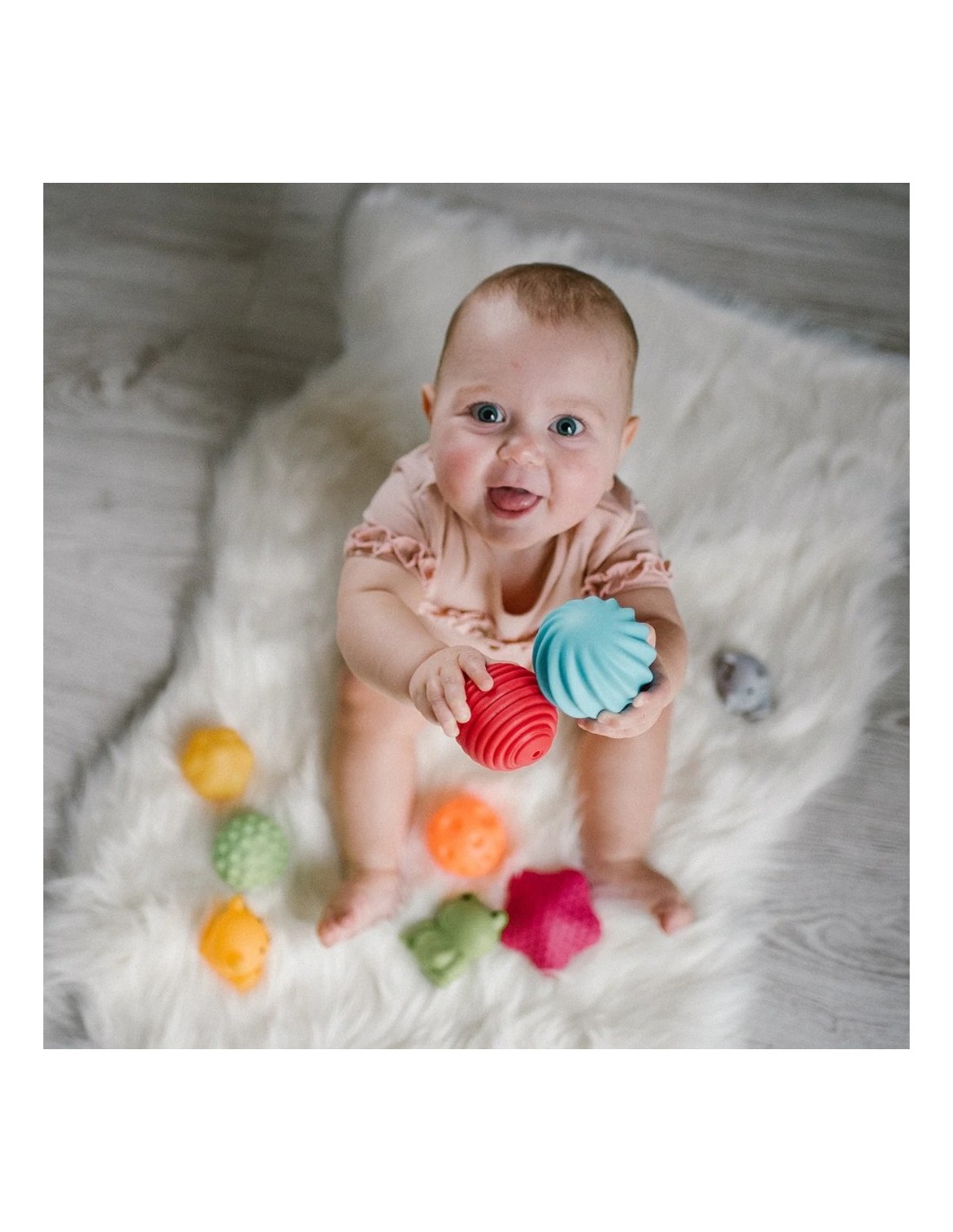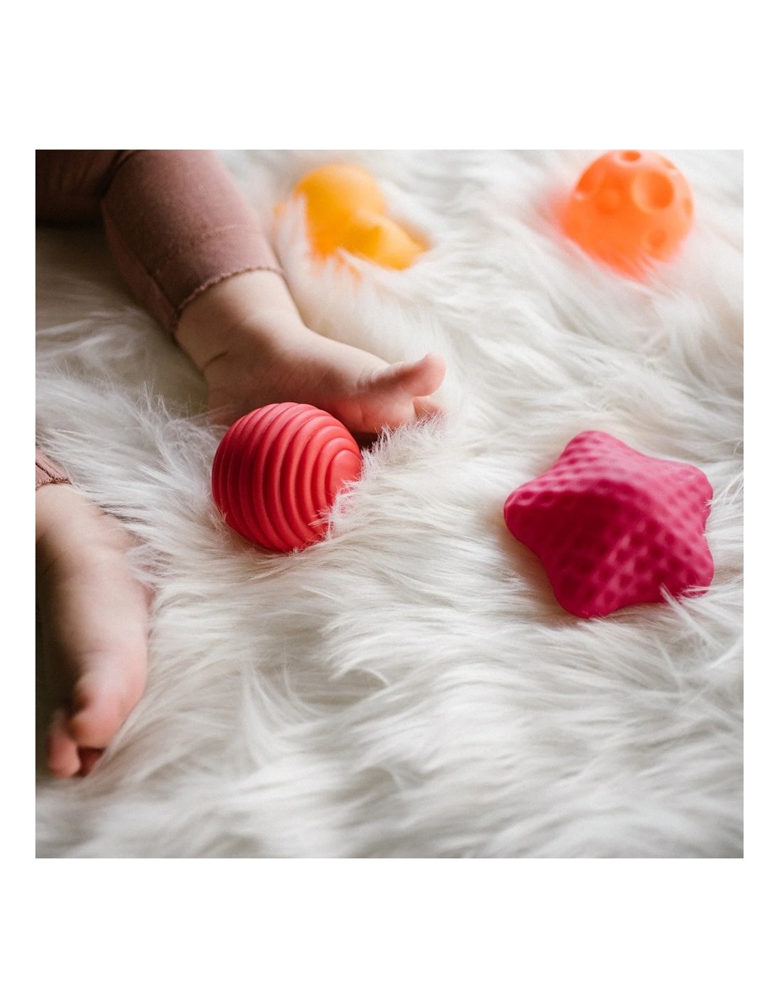 El bebé puede rodar, lanzar, apretar o morder las pelotas para explorar texturas y formas. Ideales también para actividades de fisioterapia o juegos en familia.