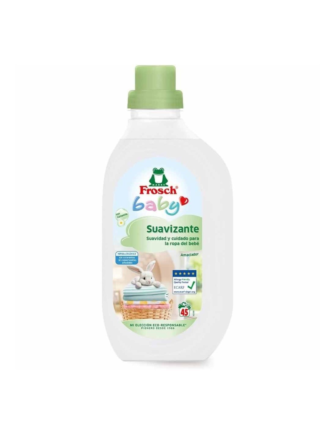 Suavizante Frosch Baby 900ml (45 lavados): deja la ropa suave y protegida, sin colorantes ni perfumes irritantes, gracias a su composición hipoalergénica.