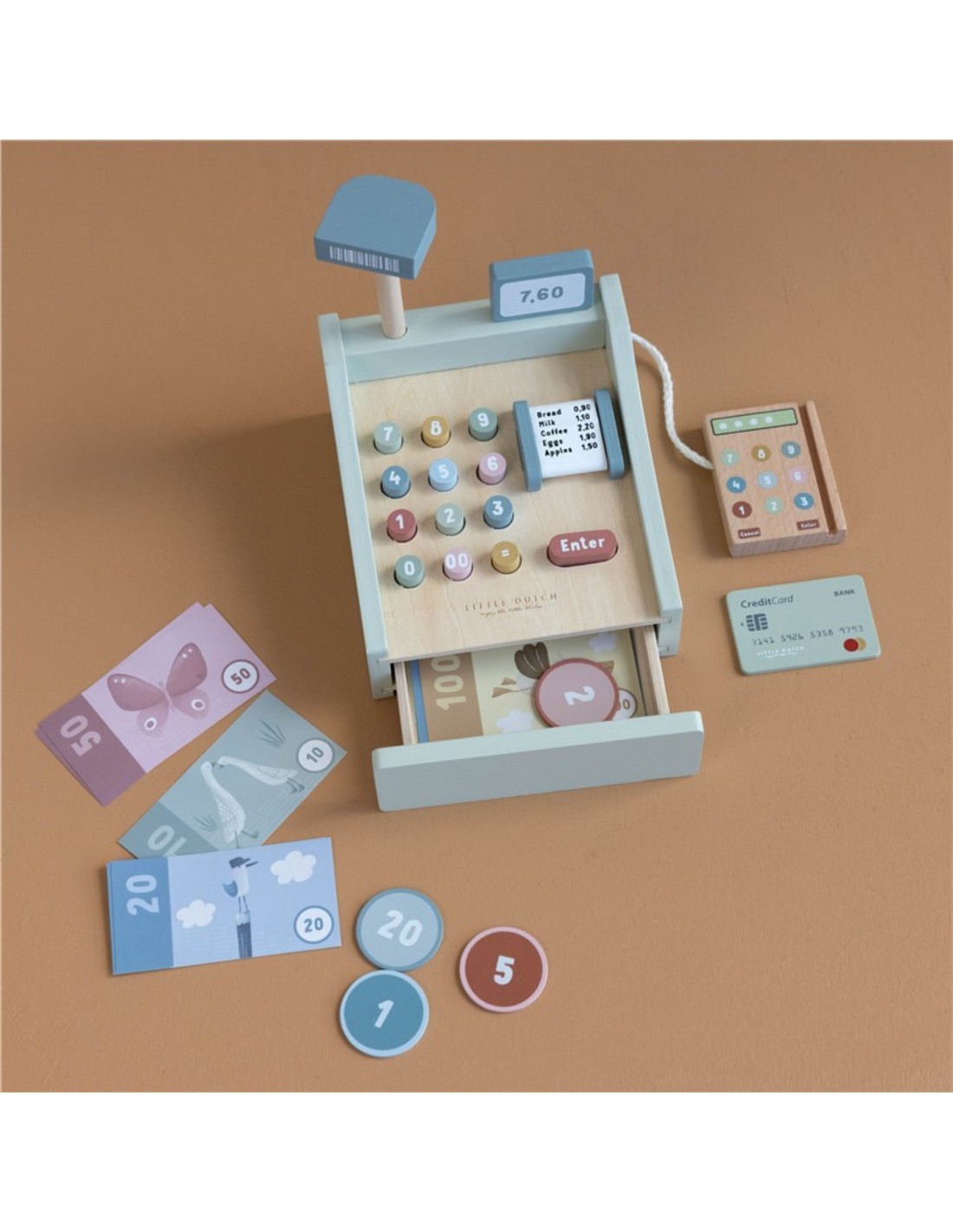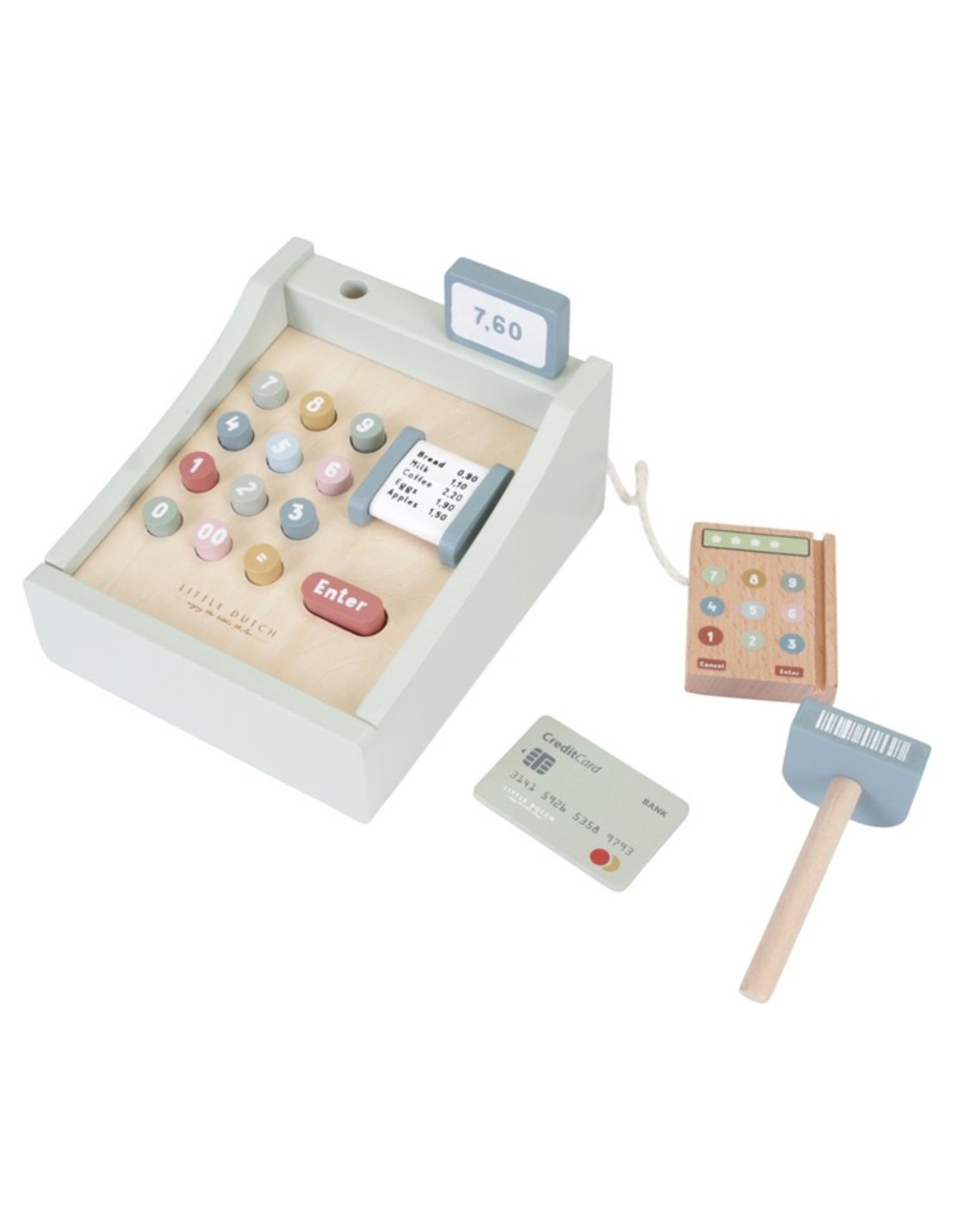 La Caja Registradora con Escáner Nuevo Col es un juguete de madera educativo y divertido, perfecto para que los niños a partir de 3 años aprendan jugando. Con ella podrán simular compras reales, escanear productos, pulsar botones para calcular el total y pagar con tarjeta o en efectivo.
