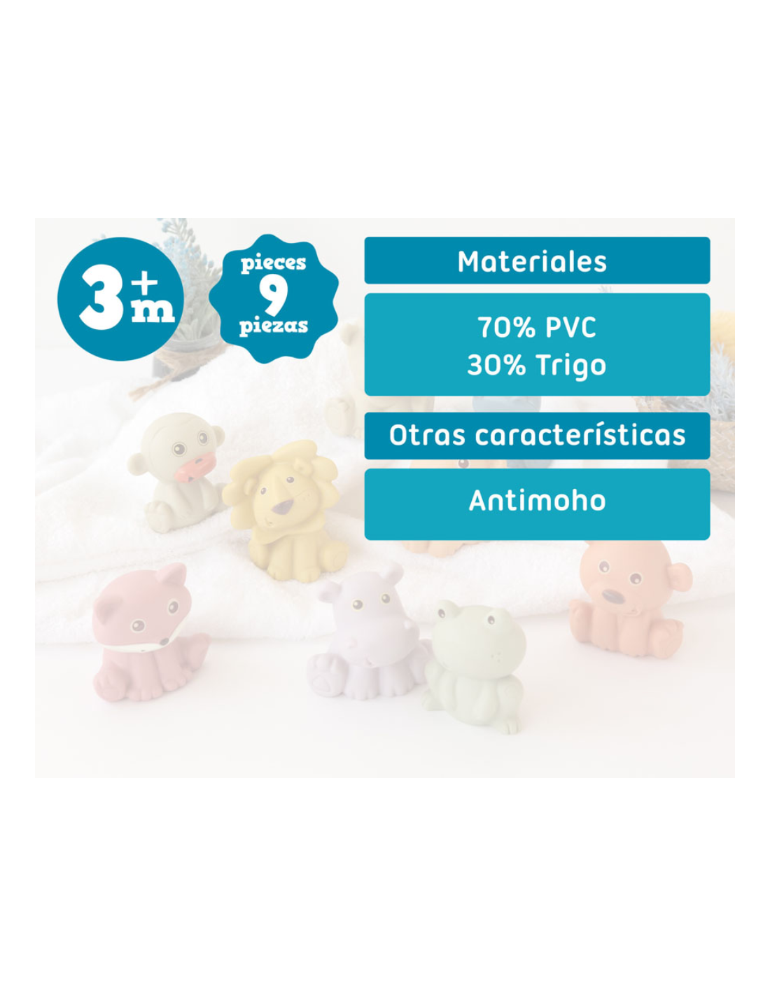 Este set incluye 9 animalitos de diferentes formas y colores, creados especialmente para estimular los sentidos del bebé durante el baño. Están fabricados con PVC suave y un 30% de trigo natural, lo que los hace más sostenibles y agradables al tacto. El diseño de los juguetes es anti-moho, lo que significa que no acumulan agua en su interior. Al no tener orificios, se evita la aparición de bacterias o moho, garantizando un entorno limpio y seguro para tu peque.