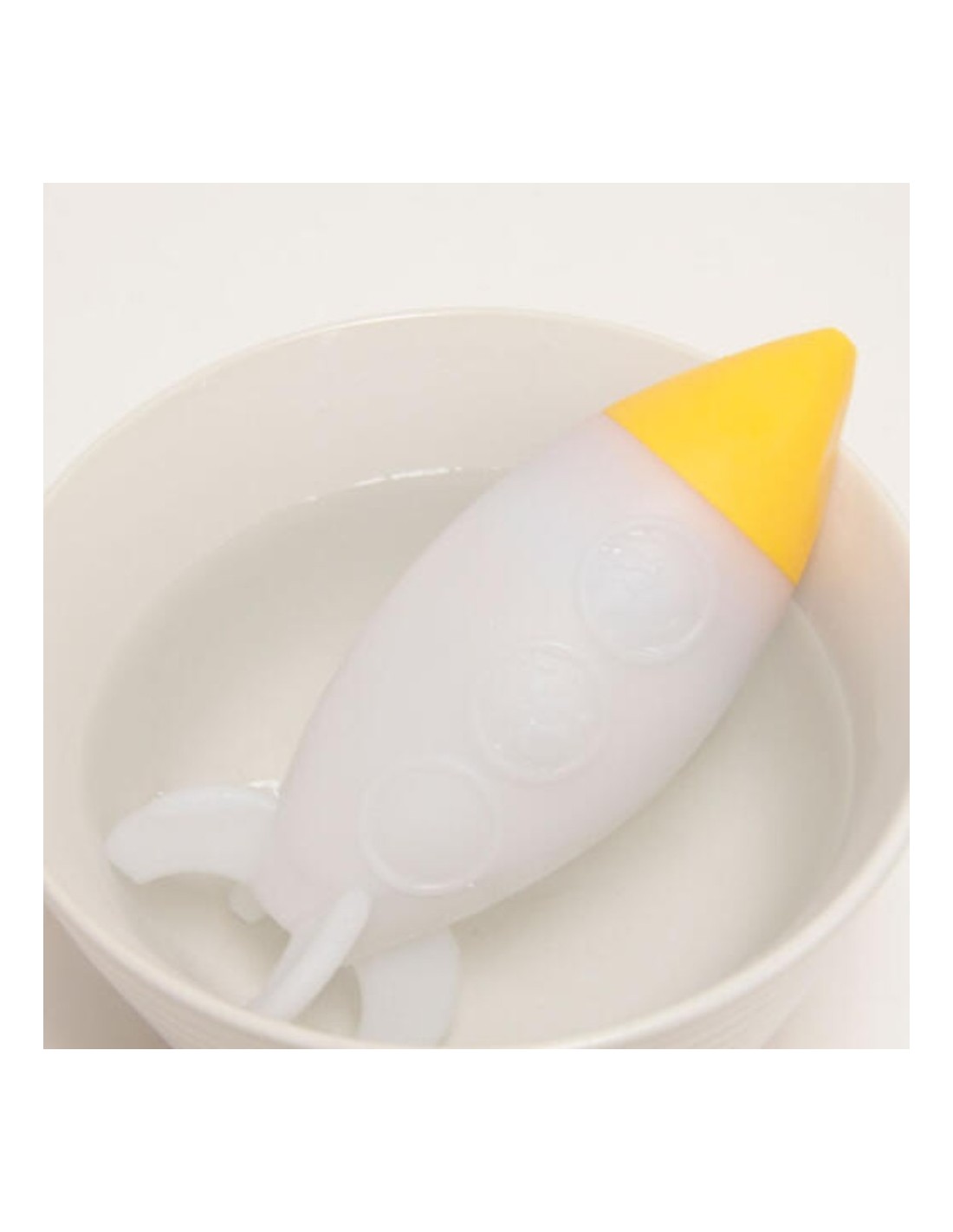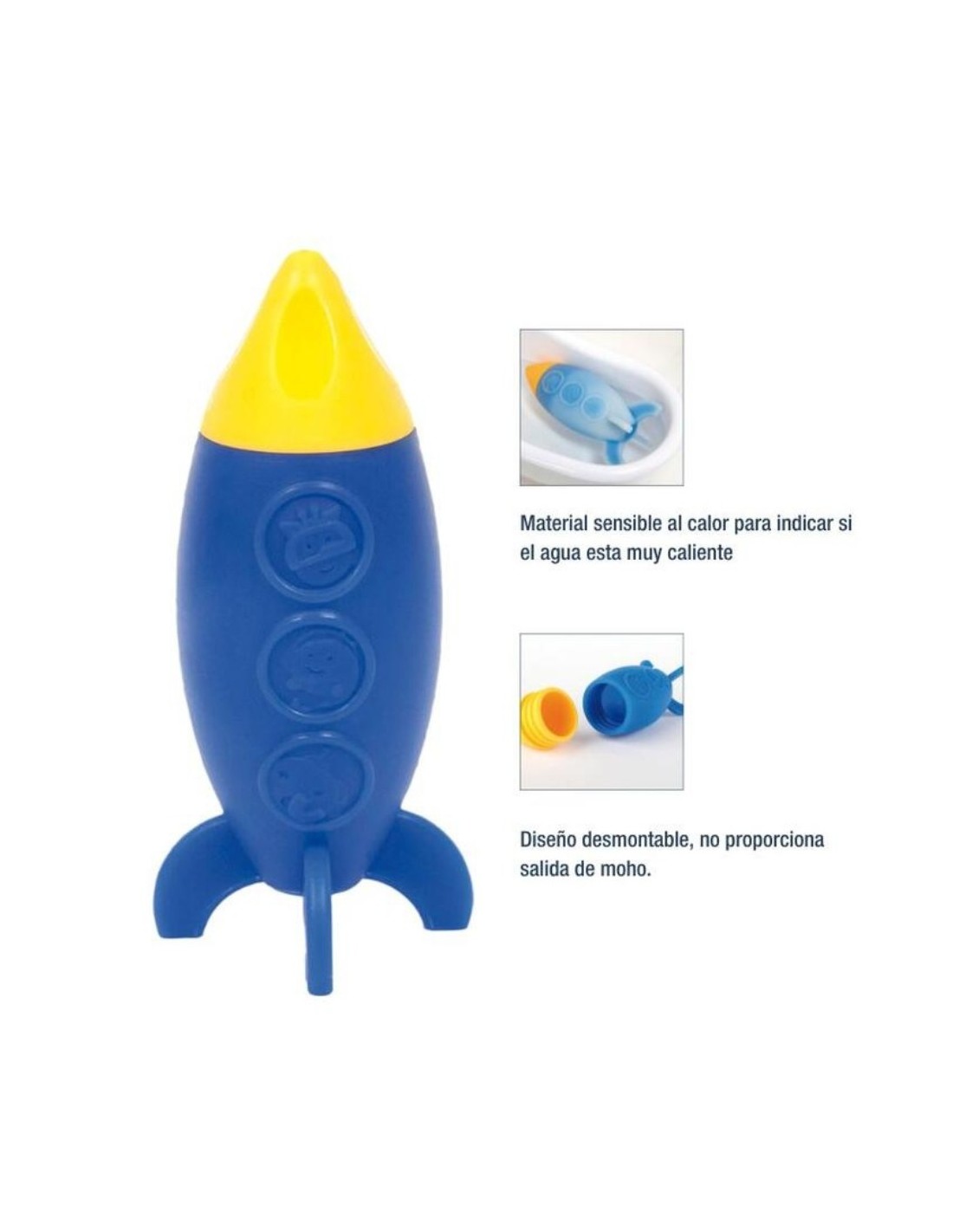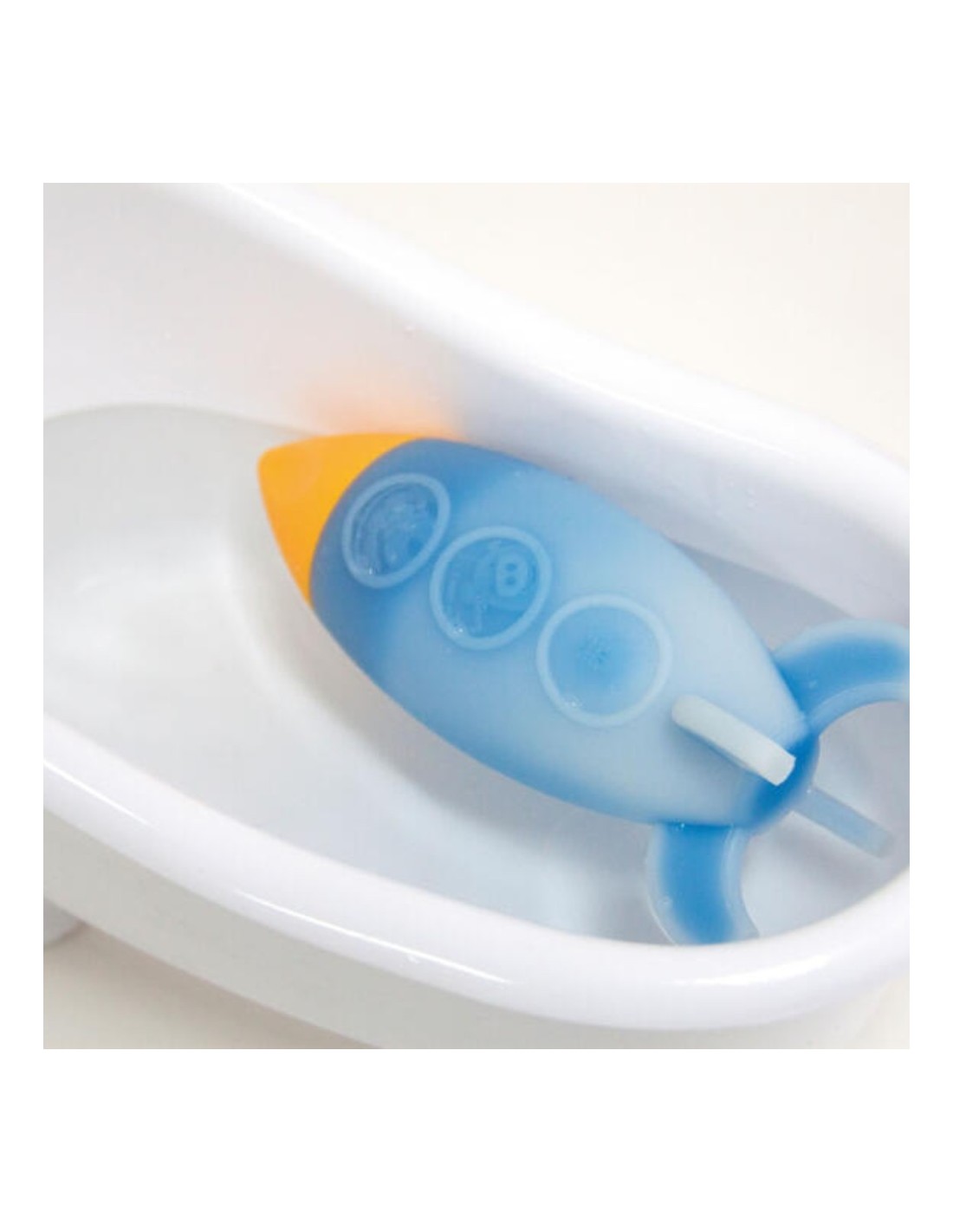 Este juguete de baño está fabricado en caucho de silicona alimentaria, un material suave, seguro y duradero. Su parte azul es termosensible, lo que permite detectar si el agua está demasiado caliente de un solo vistazo. Su diseño es desmontable, lo que impide que quede agua acumulada en su interior, ayudando a prevenir la aparición de moho u hongos. Además, es totalmente libre de BPA y ftalatos, ideal para bebés desde los 0 meses. Se puede lavar en el lavavajillas o esterilizar, garantizando siempre una higiene impecable. Su forma y tamaño lo hacen cómodo de agarrar por manos pequeñas y perfecto como primer juguete de baño.
