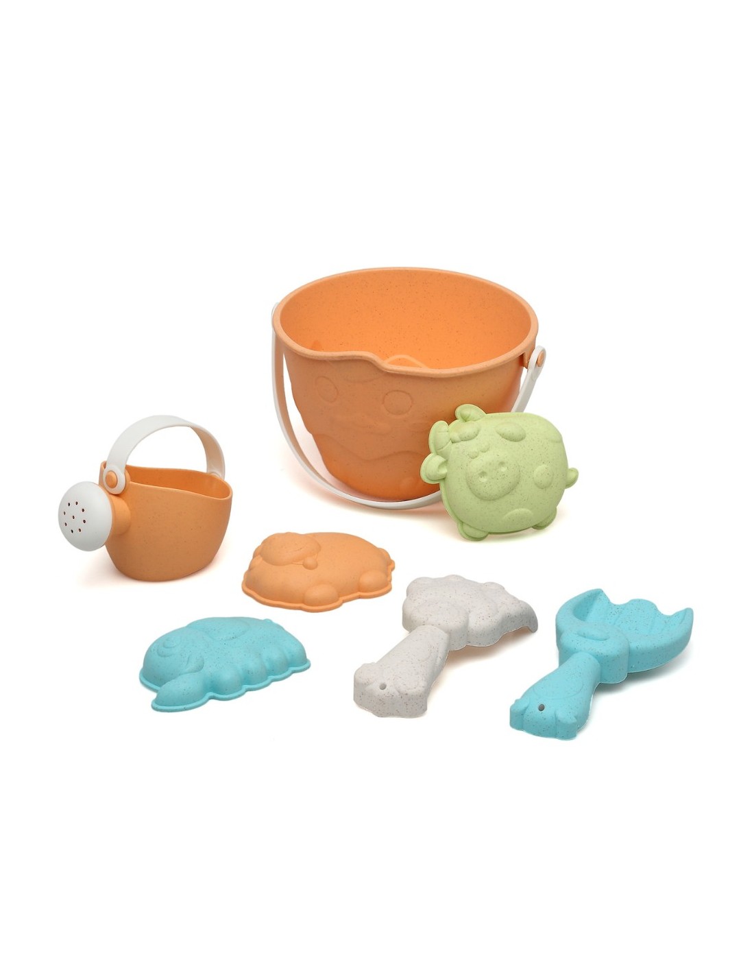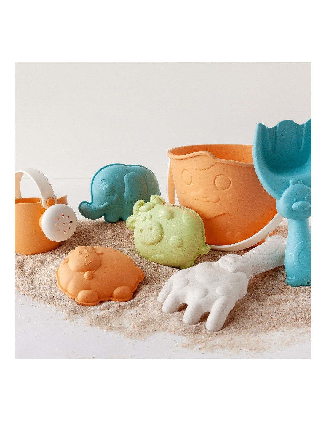 Un cubo, una pala, un rastrillo y varios moldes de arena con formas de animales. - ¿Solo sirve para la playa?
