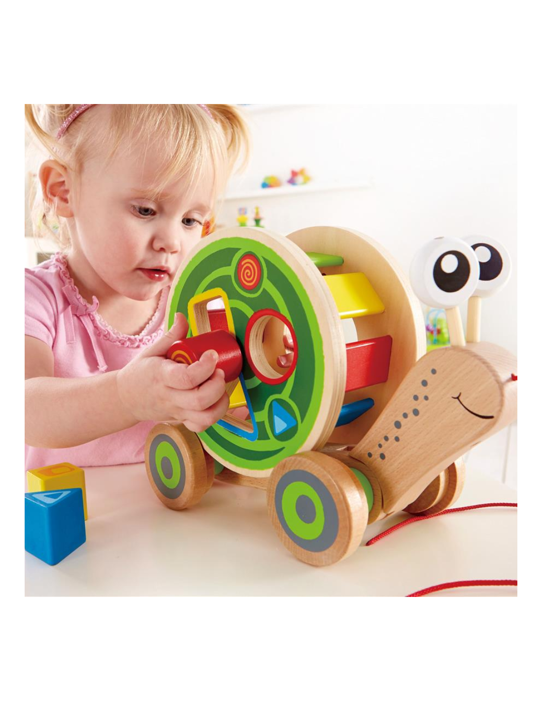 Clasifica por forma y color; cuenta las piezas en voz alta; arrastra el caracol trazando circuitos; practica turnos de “meter y sacar” para trabajar la paciencia y el lenguaje.