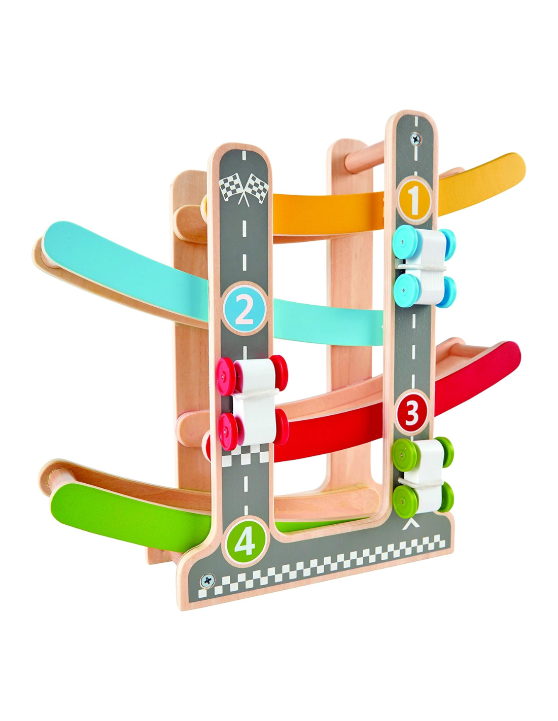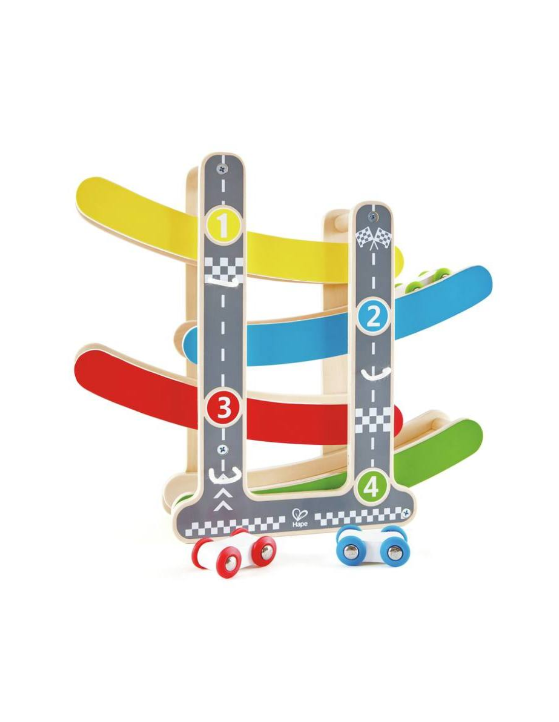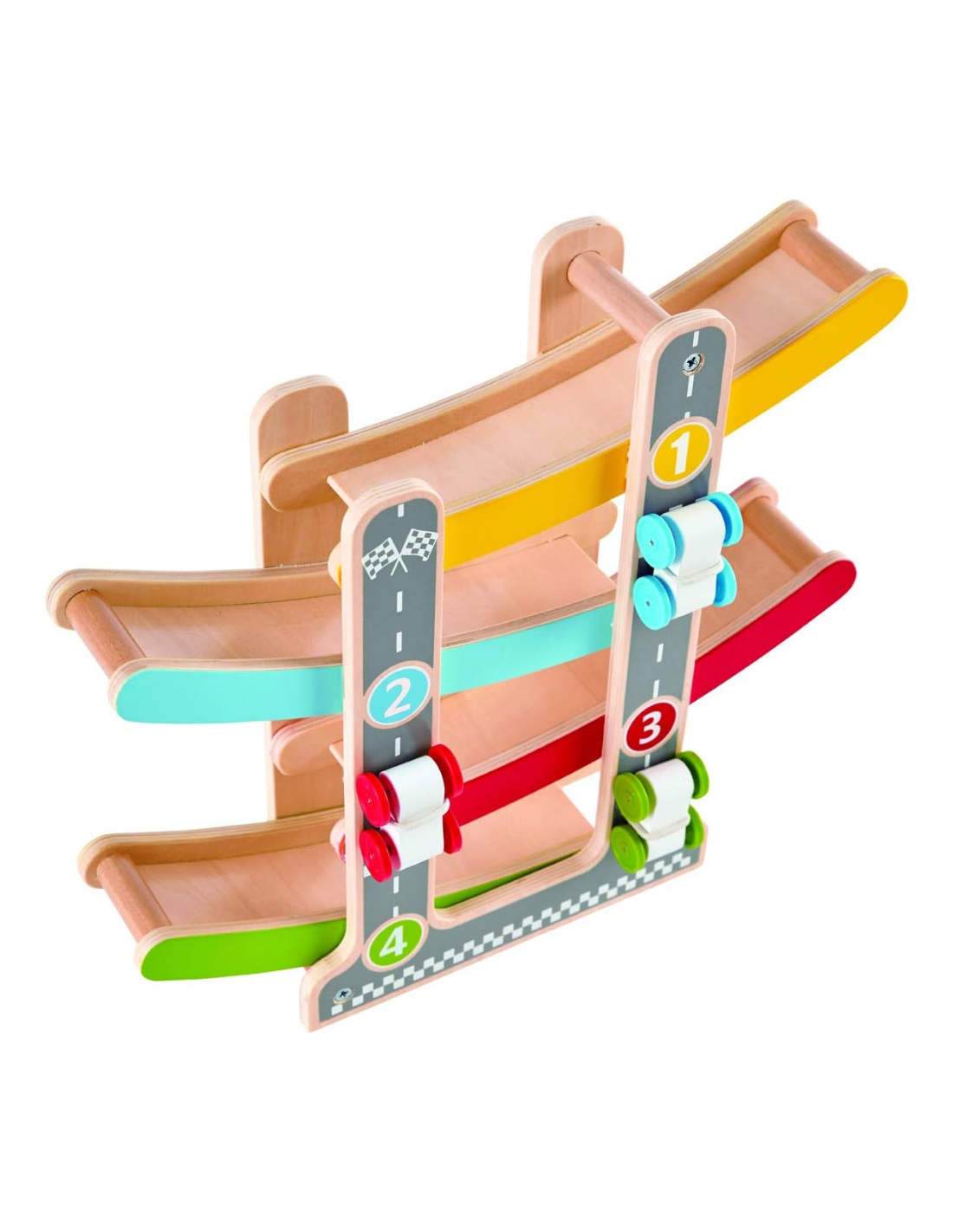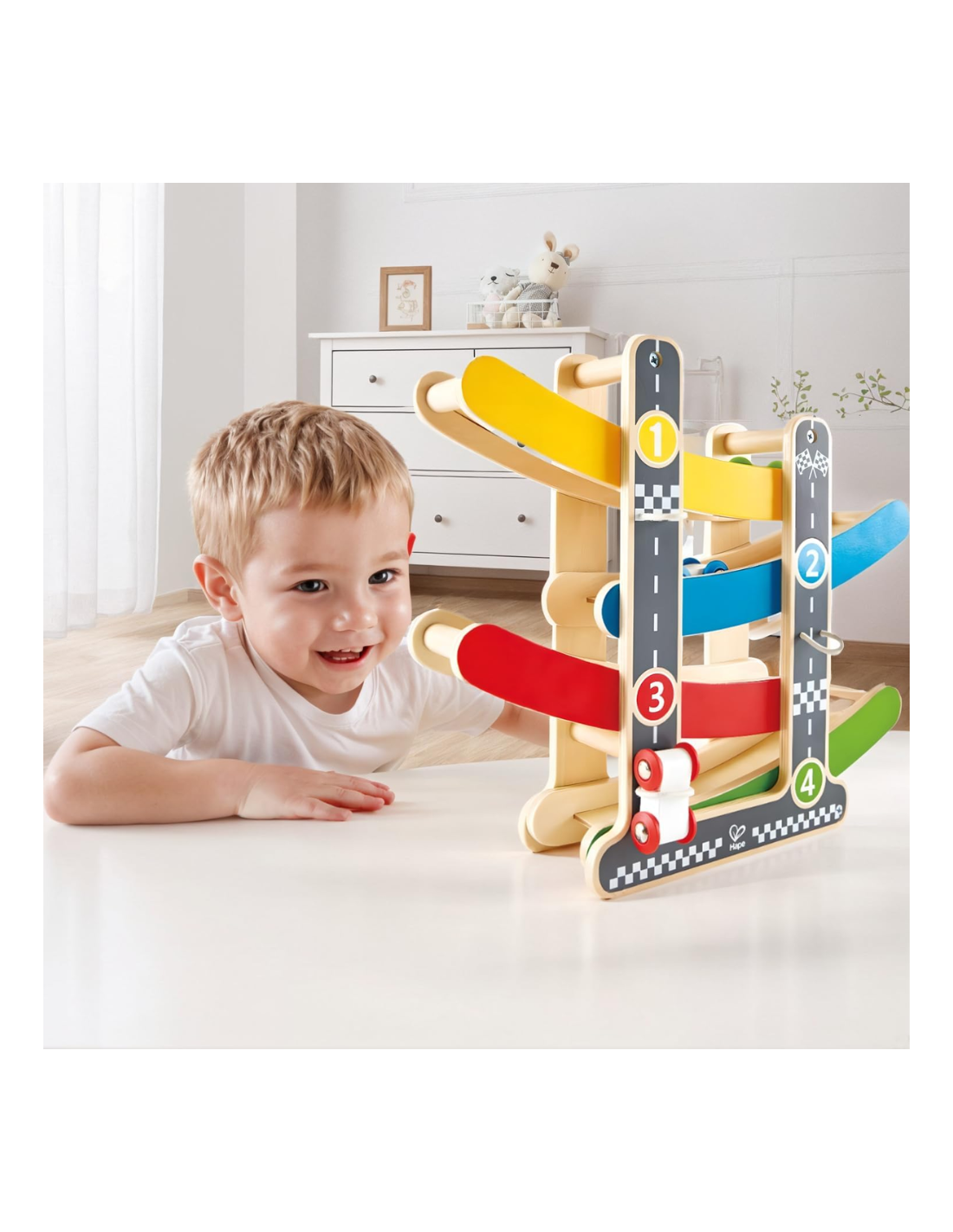 Sí, la pista está fabricada con madera segura y duradera y diseñada sin bordes afilados, lo que la convierte en un juguete adecuado para los más pequeños.