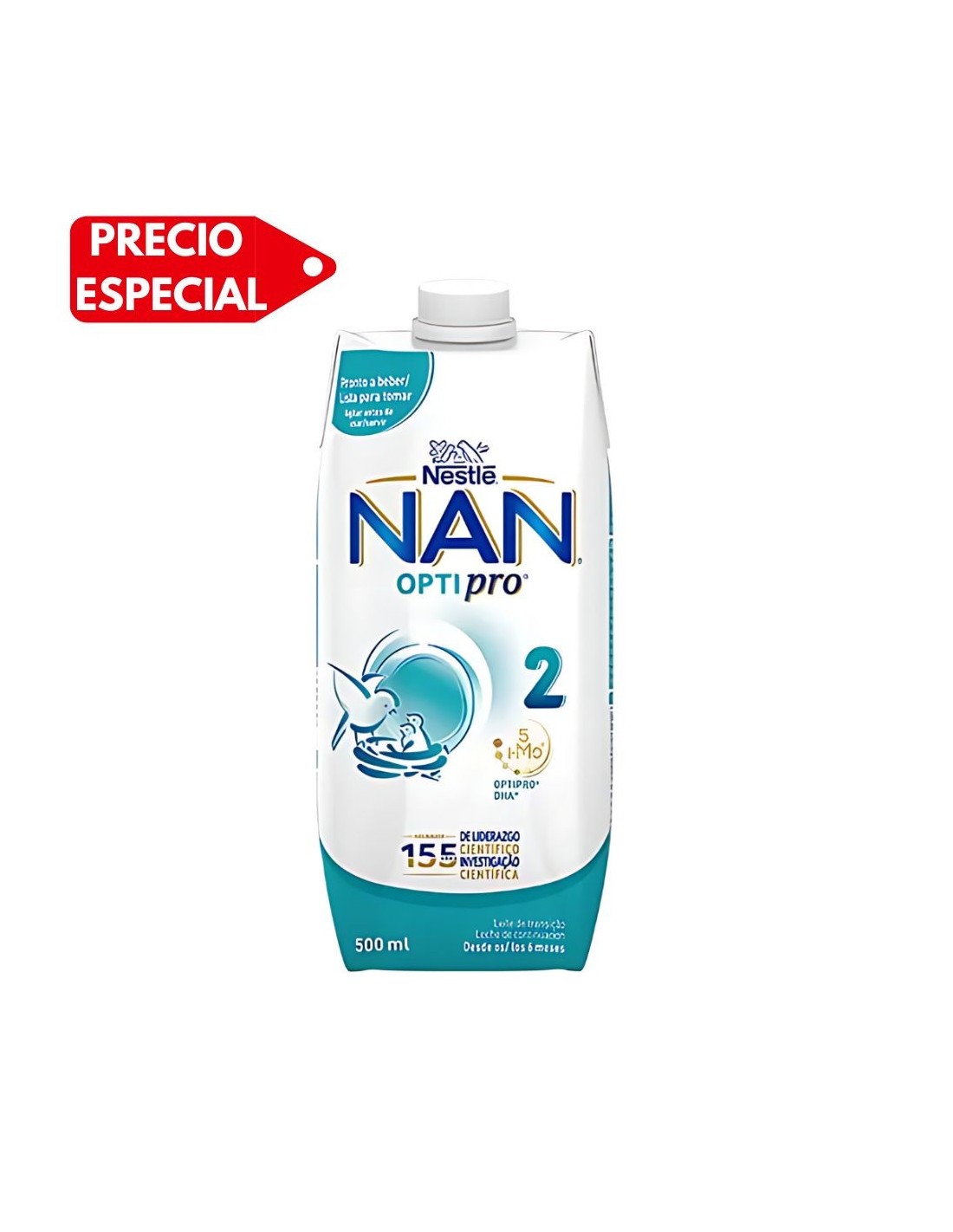 La NAN OPTIPRO 2 Líquida 500 ml Nestlé es la versión lista para usar de la reconocida fórmula NAN OPTIPRO®, especialmente desarrollada para bebés a partir de los 6 meses, cuando la lactancia materna no es posible o se complementa dentro de una dieta diversificada. Gracias a su exclusiva tecnología OPTIPRO, contiene proteínas de alta calidad en la cantidad adecuada, que favorecen una digestión más fácil y un desarrollo equilibrado. Incluye DHA (ácido docosahexaenoico), fundamental para el desarrollo cerebral y visual, y una combinación de vitaminas A, C y D, así como minerales esenciales como el hierro, calcio y zinc, que contribuyen al correcto funcionamiento del sistema inmunitario y la formación ósea. Esta fórmula líquida, lista para consumir directamente, ofrece una alternativa práctica y segura, con la garantía de calidad de Nestlé, líder en nutrición infantil desde hace más de 150 años.