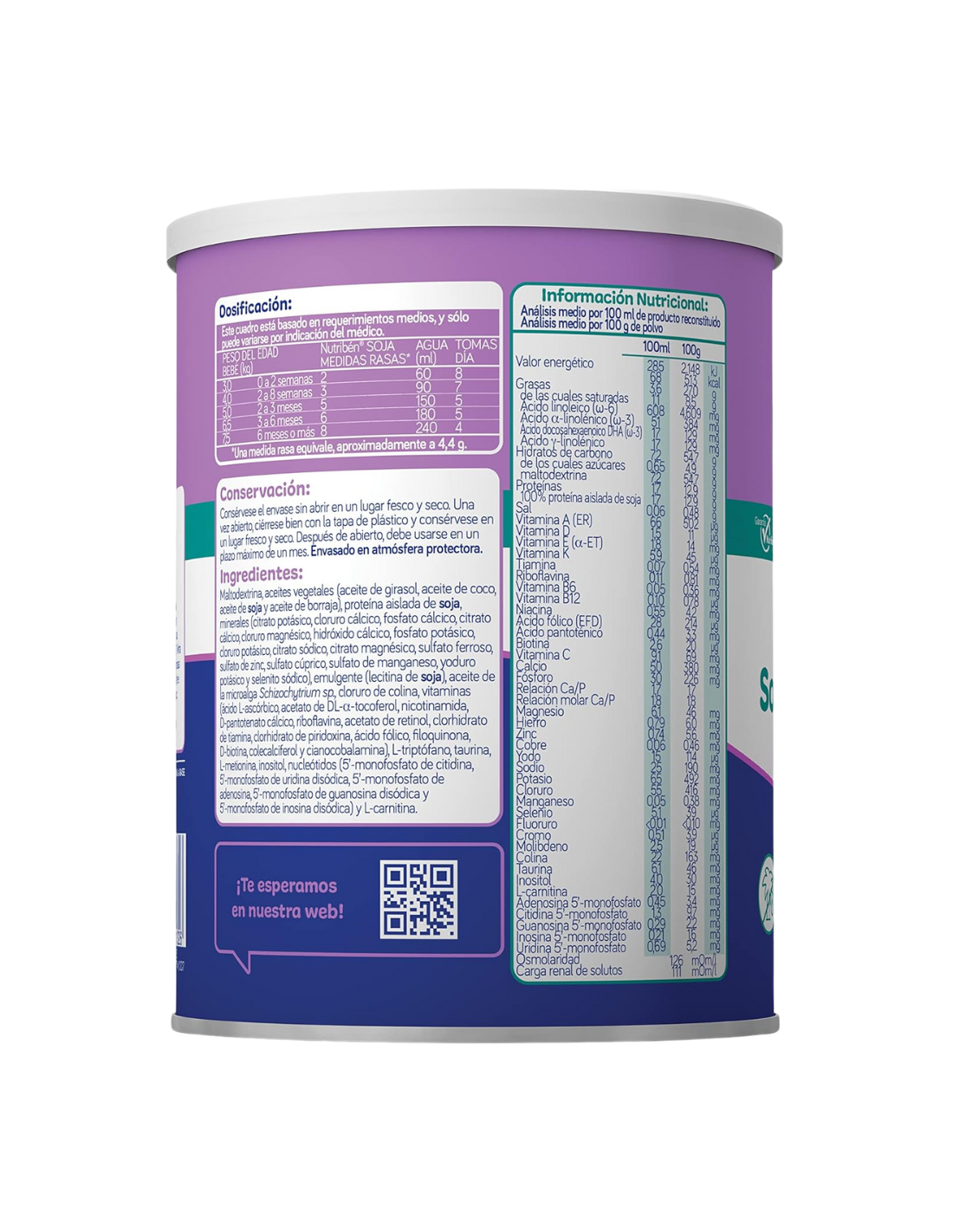 Su fórmula está libre de lactosa, gluten y aceite de palma, y es adecuada en casos de intolerancia a la lactosa, galactosemia o alergia a las proteínas de la leche de vaca.
