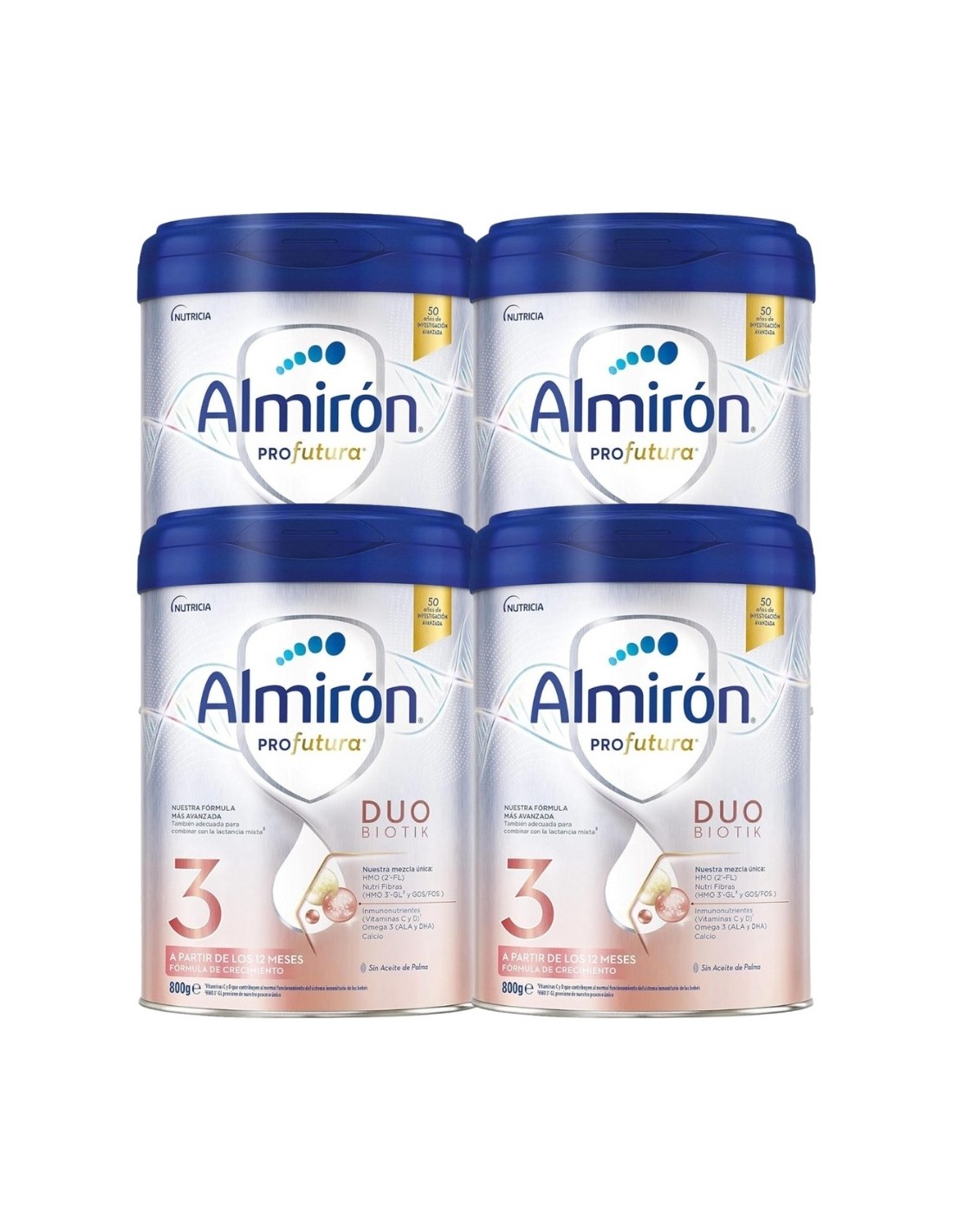 El Pack 4 Leches Almirón Profutura Duobiotik 3 800 g ofrece la fórmula más avanzada de Almirón para bebés de 12 a 36 meses.