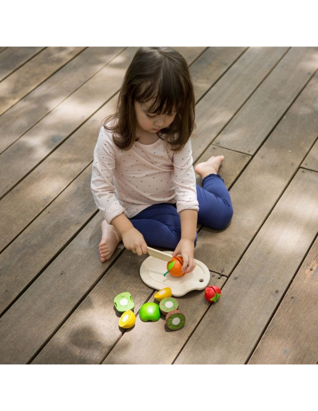 Coloca las frutas en la tabla, corta con el cuchillo de madera y vuelve a unirlas con el velcro para repetir el juego. Ideal para sesiones de juego en solitario o compartido con la familia.