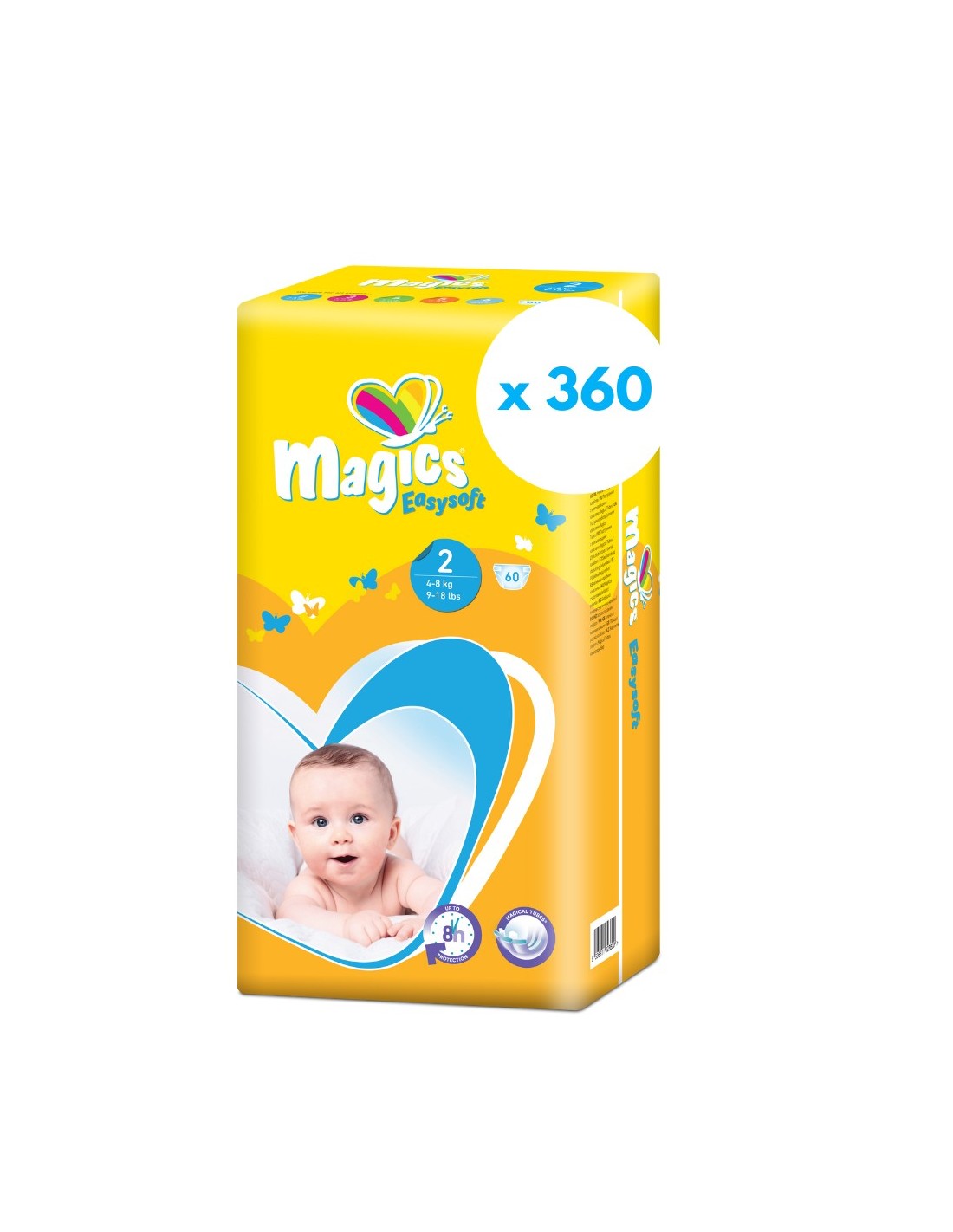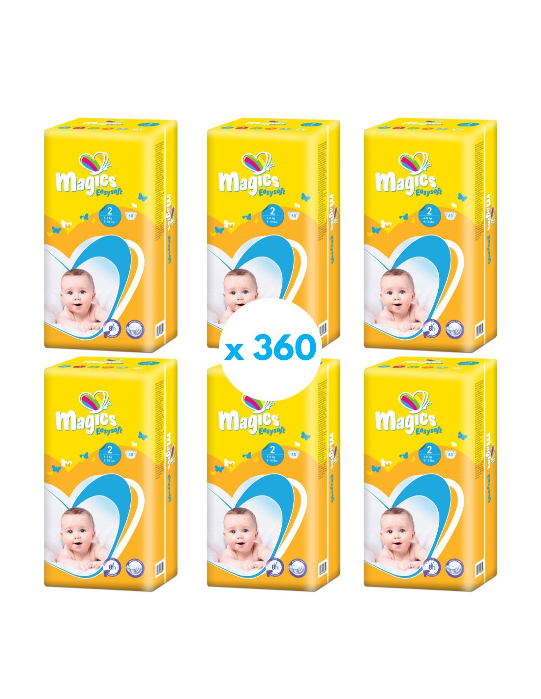 El Pack XXL de Pañales Magics EasySoft Talla 2 (360 uds) está diseñado para cubrir las necesidades diarias de bebés de 4 a 8 kg, con la mejor relación cantidad–precio. Con sus 6 paquetes de 60 unidades, es perfecto para familias que buscan comodidad, ahorro y una protección fiable día y noche.