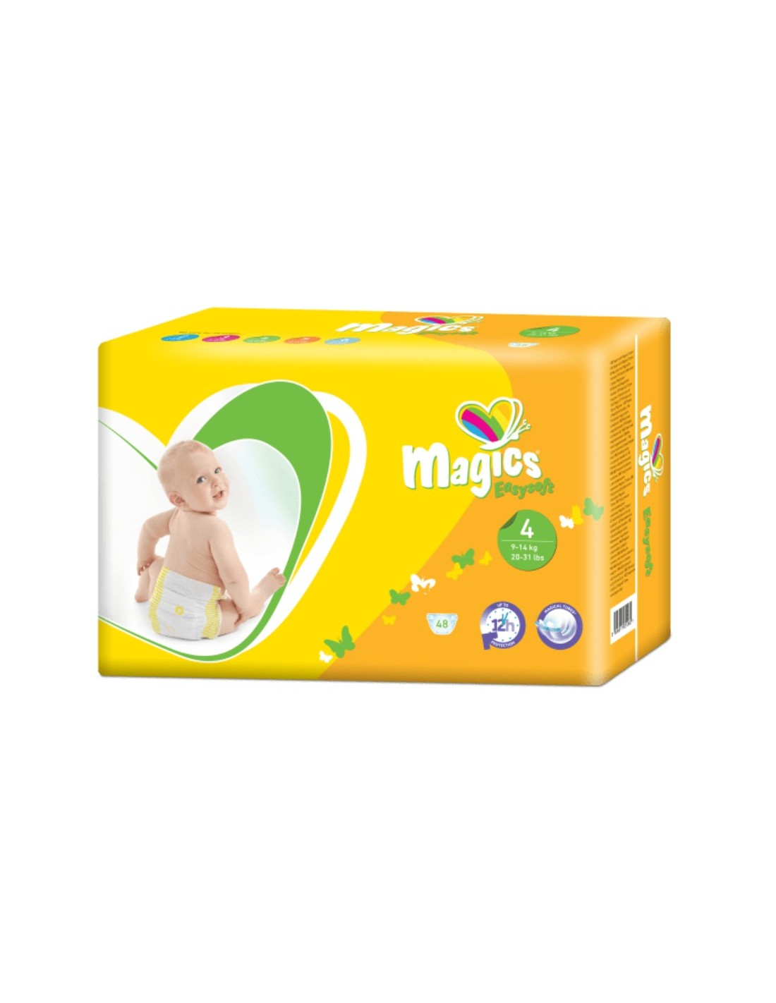 Los pañales Magics EasySoft incorporan una capa absorbente de alta tecnología, con canales que distribuyen la humedad para mantener la piel seca hasta 12 horas. Disponen de barrera antifugas, cintura elástica, y un indicador de humedad que cambia de color cuando es hora de cambiar el pañal. Están dermatológicamente testados y no contienen perfumes ni lociones.