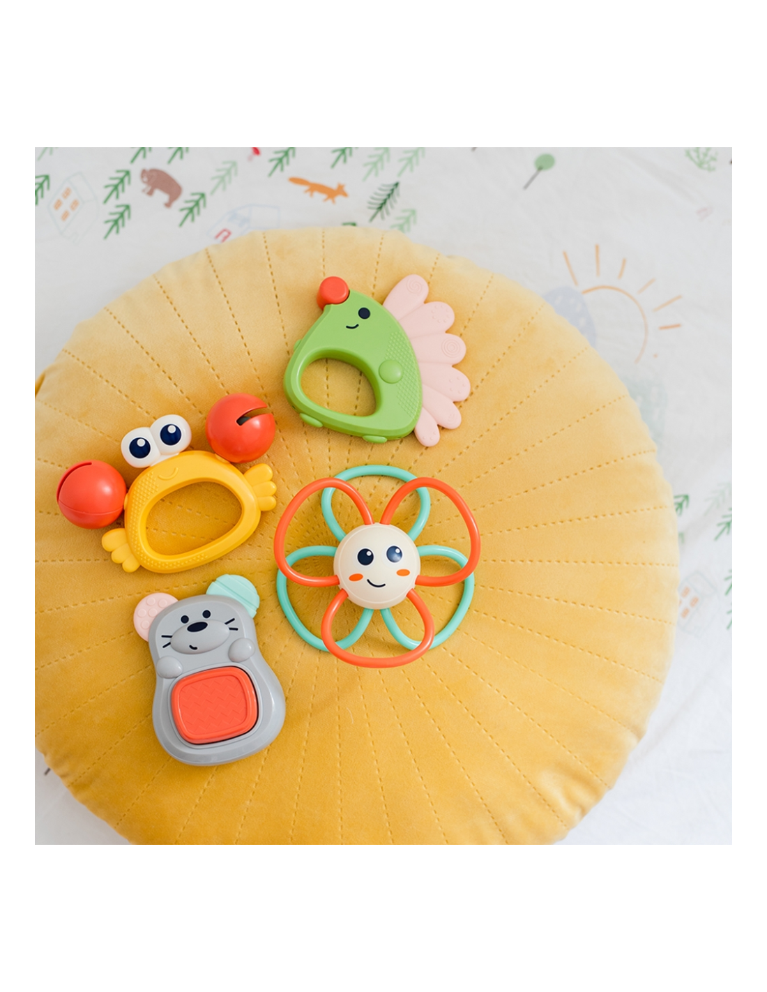 Este mordedor estimula el agarre, la coordinación mano-ojo y el juego interactivo, favoreciendo el desarrollo motor y cognitivo del bebé.