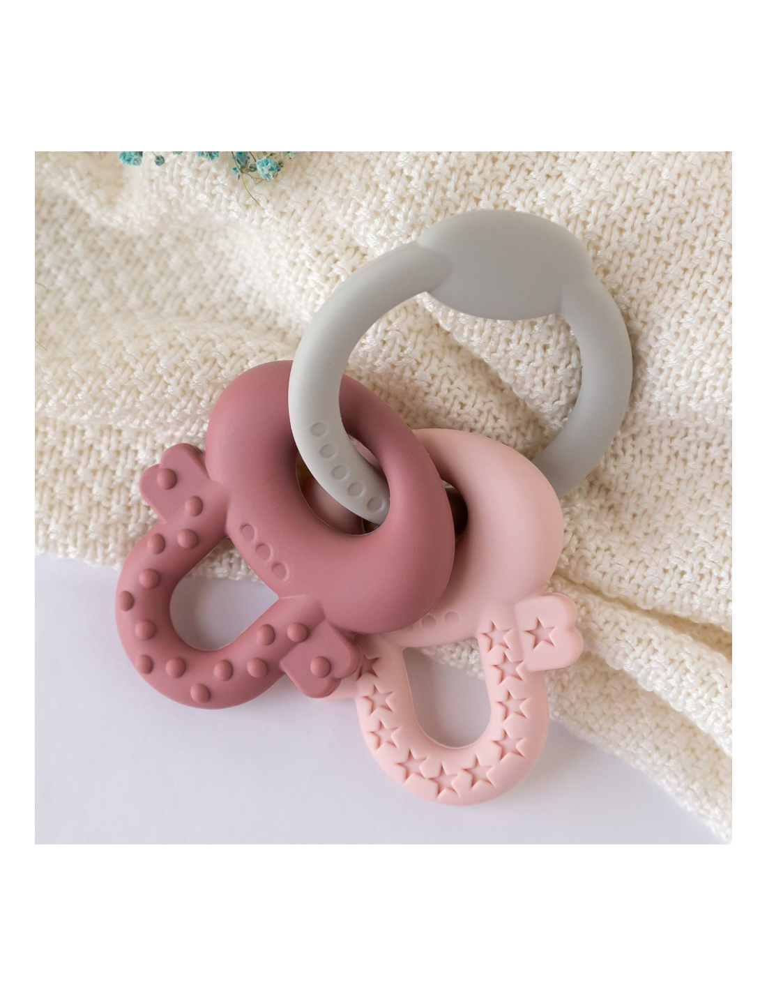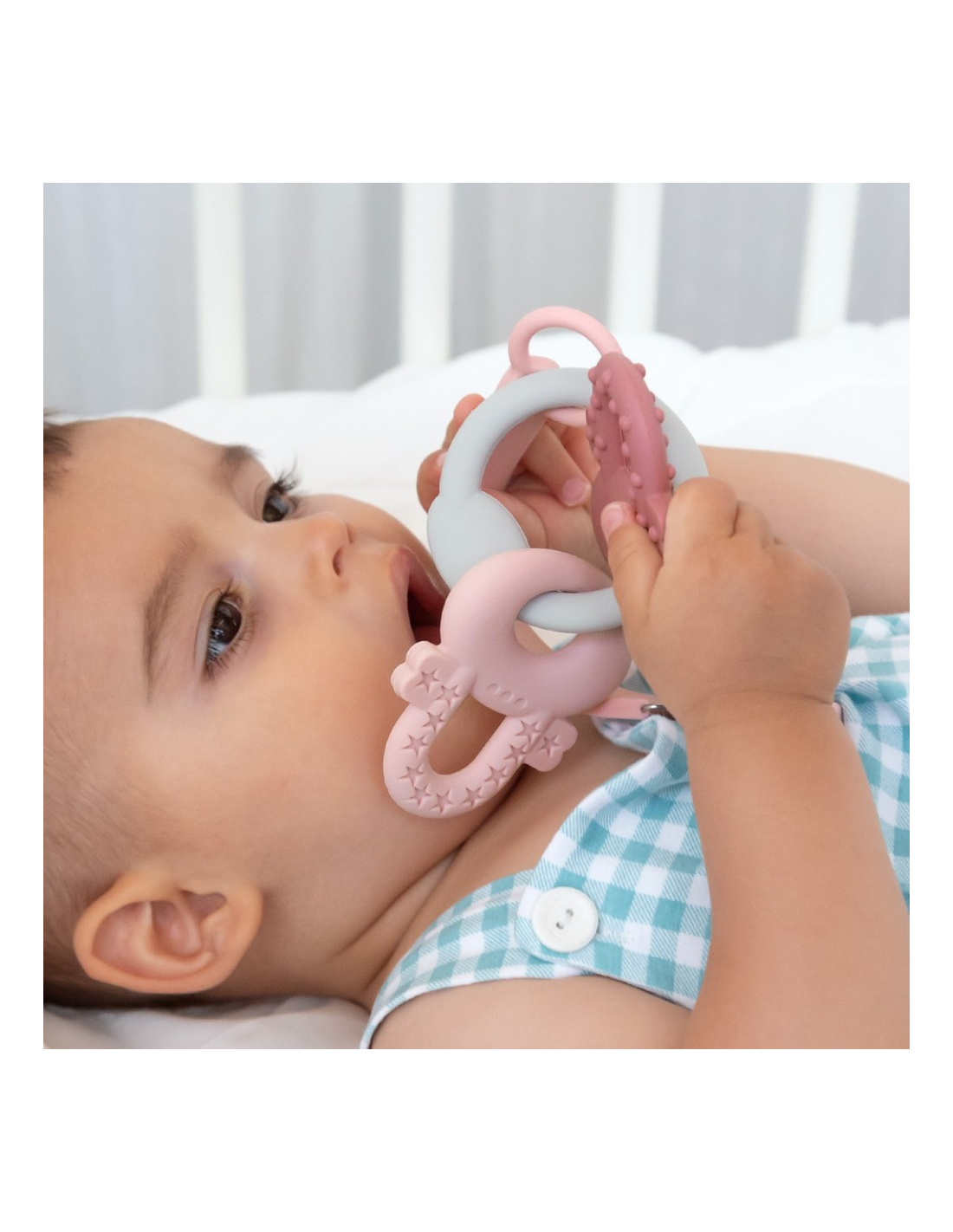• Alivio eficaz durante la dentición: Las texturas variadas del mordedor proporcionan un suave masaje a las encías, ayudando a aliviar las molestias.