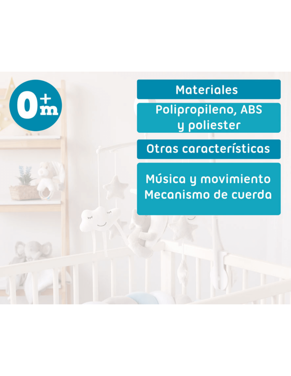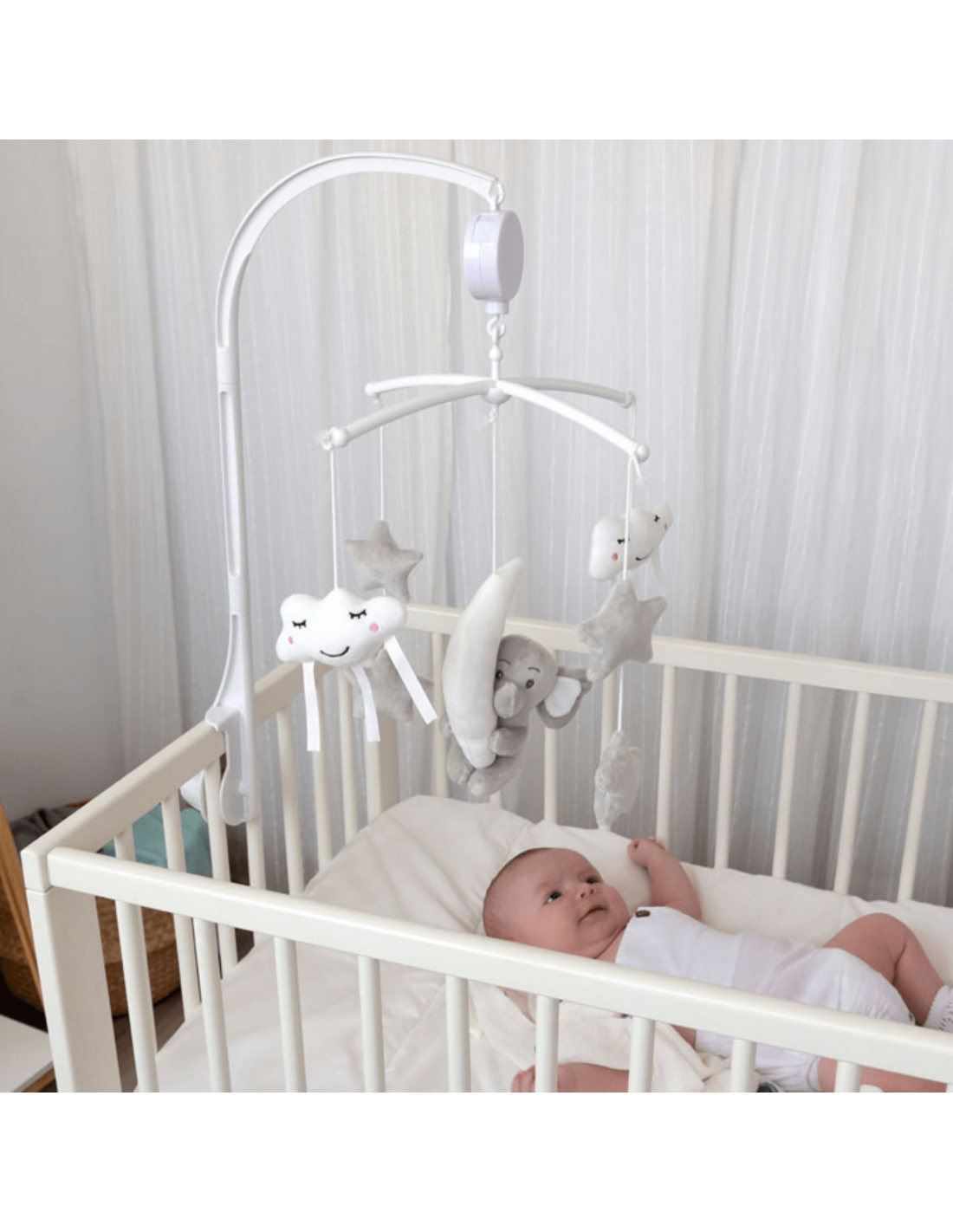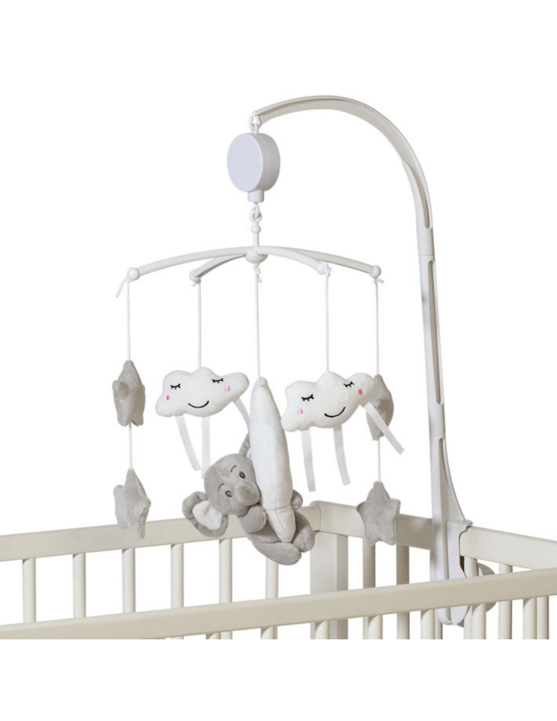 El móvil musical de cuna con elefante gris Kiokids (+0M) está diseñado para acompañar al bebé en sus momentos de descanso, creando un ambiente tranquilo y relajante. Con un elefante, nubes y estrellas que giran suavemente al ritmo de una nana, ayuda a calmar al pequeño y a favorecer un sueño reparador. La base del móvil se fija de manera segura a los barrotes de la cuna, y su sencillo mecanismo de cuerda activa el movimiento giratorio y la melodía, sin necesidad de pilas. Pertenece a la colección Dolci Amici, caracterizada por sus tonos neutros y delicados, ideales para cualquier habitación infantil.