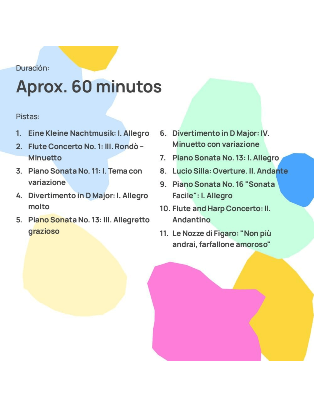 - Incluye una selección de piezas clásicas de Mozart adaptadas a niños.
