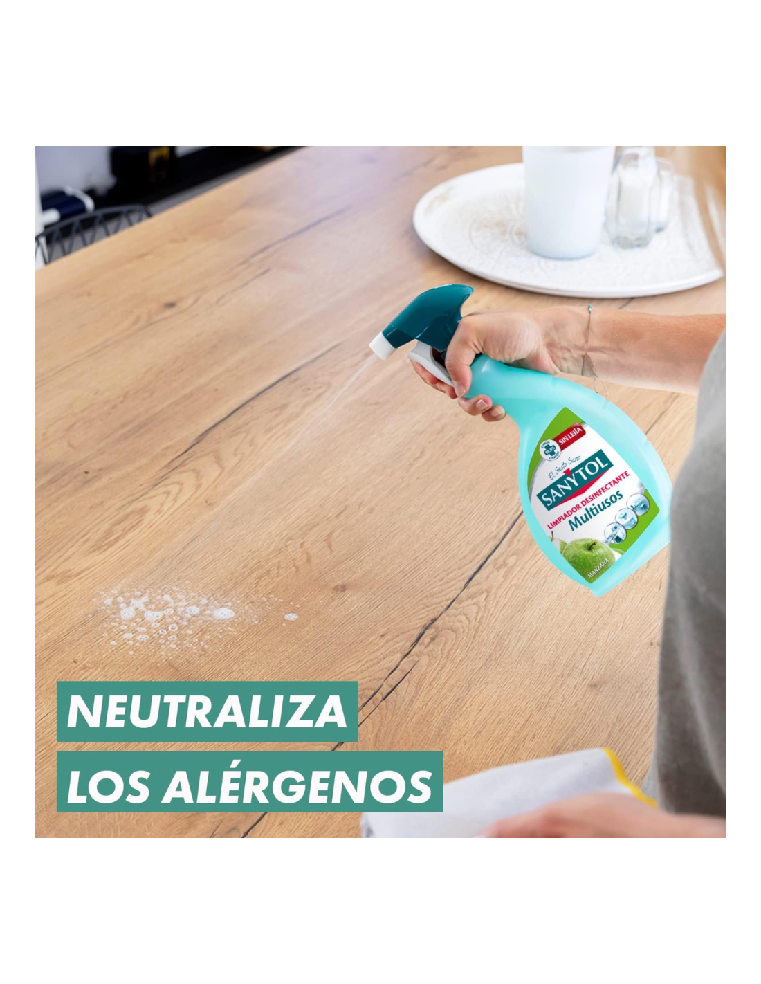 El limpiador desinfectante multiusos de Sanytol con su exclusiva fórmula, limpia y desinfecta de una pasada sin necesidad de usar lejía. Elimina el 99.9% de gérmenes: bacterias como el s.Aureus o e. Coli, hongos como el causante de la candidiasis o el moho de los vegetales y virus envueltos. Además, elimina malos olores y neutraliza los alérgenos más comunes del hogar como los ácaros del polvo, de gatos, esporas de moho y polen. Es apto para todo tipo de suelos y superficies, incluso delicadas como madera, mármol y acero inoxidable. Es seguro para las personas, ya que al no contener lejía, no desprende vapores nocivos ni decolora. Dermatológicamente testado. Sin fosfatos, ftalatos ni disruptores endocrinos.