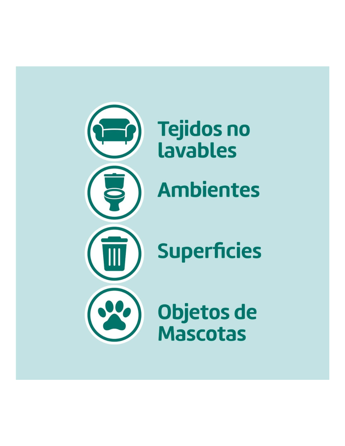 Este desinfectante es apto para una amplia gama de superficies del hogar, como mesas, pomos de puertas, alfombras, sofás, cortinas, ropa y otras telas. Está diseñado para usarse tanto en superficies duras como en tejidos, asegurando una desinfección completa del entorno.