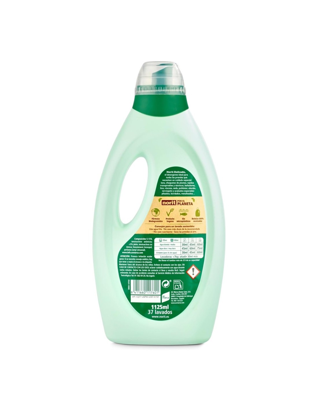 El Detergente Líquido Delicado a Máquina de Norit asegura el máximo cuidado en cada lavado gracias a su fórmula dermatológicamente testada. Está formulado para proteger las fibras delicadas y evitar el desgaste prematuro de las prendas , conservando su suavidad y forma original. Ideal para prendas que requieren un cuidado especial, como ropa de lana o tejidos delicados, este detergente también actúa eficazmente en la protección de los colores , evitando que se destiñan o pierdan intensidad. Su formato de 1125 ml es ideal para numerosos lavados, asegurando resultados excepcionales.