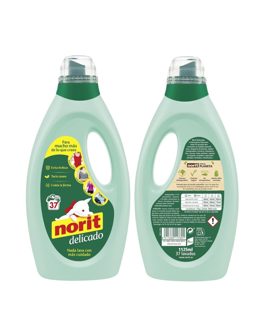 El Detergente Líquido Delicado a Máquina de Norit asegura el máximo cuidado en cada lavado gracias a su fórmula dermatológicamente testada. Está formulado para proteger las fibras delicadas y evitar el desgaste prematuro de las prendas , conservando su suavidad y forma original. Ideal para prendas que requieren un cuidado especial, como ropa de lana o tejidos delicados, este detergente también actúa eficazmente en la protección de los colores , evitando que se destiñan o pierdan intensidad. Su formato de 1125 ml es ideal para numerosos lavados, asegurando resultados excepcionales.