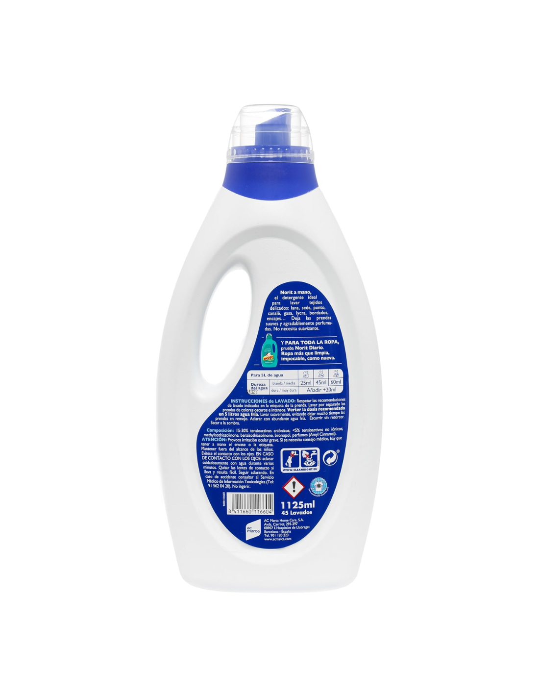 Cumple con el Reglamento (CE) nº 648/2004 sobre detergentes y el Reglamento (UE) 2025/40 sobre etiquetado de productos químicos domésticos. Producto dermatológicamente testado y formulado para minimizar el riesgo de alergias. Libre de fosfatos, cloro y blanqueantes ópticos. Fabricado en España bajo certificaciones ISO 9001 (calidad) e ISO 14001 (medio ambiente).
