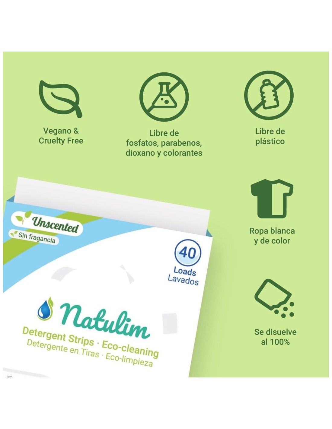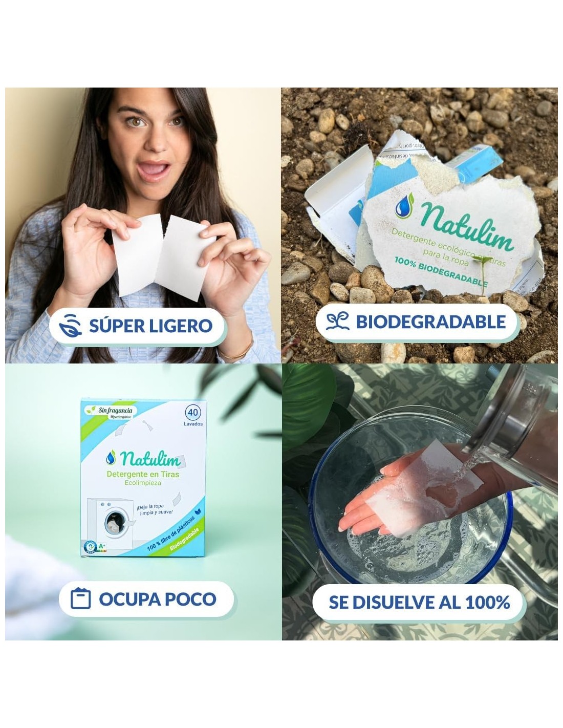 - Ahorra espacio en el armario: Olvídate de los envases voluminosos de detergente líquido o en polvo. Natulim es compacto y fácil de almacenar.