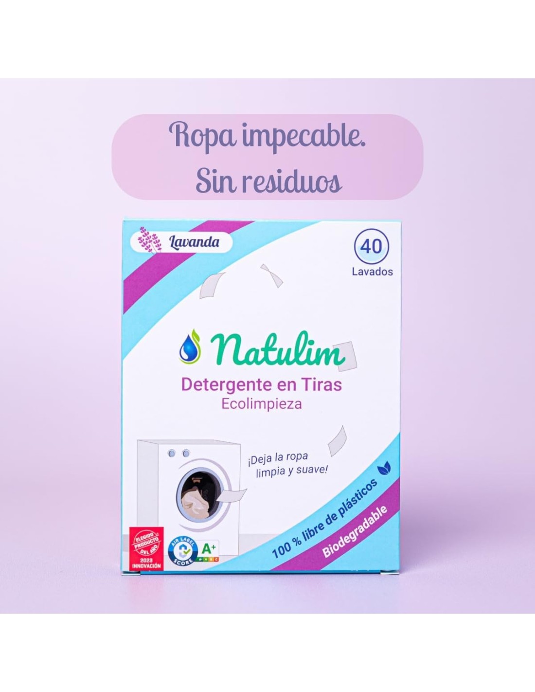 Ecológico y biodegradable: Fórmula respetuosa con el medio ambiente, sin plásticos ni microplásticos. Aroma natural a lavanda: Proporciona una sensación de frescor y calma en cada lavado. Formato compacto: Caja ligera y tiras predosificadas que ocupan 90% menos espacio que detergentes líquidos o en polvo. Eficacia contra manchas: Elimina la suciedad y protege todo tipo de tejidos. Apto para piel sensible: Dermatológicamente testado, ideal para bebés y personas con piel delicada. Uso sencillo: Basta con introducir una tira en el tambor de la lavadora.
