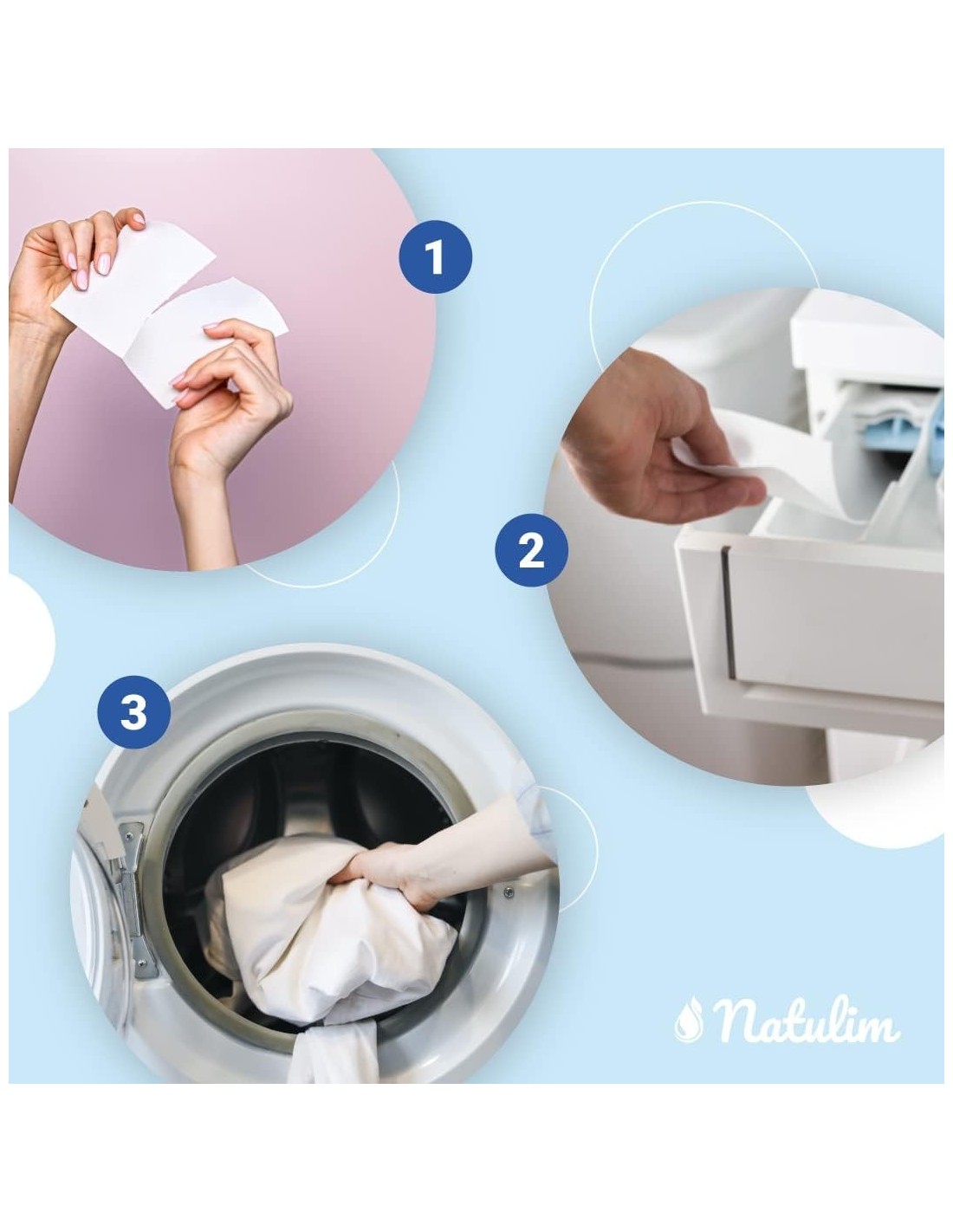 - Fácil de usar y sin derrames: Solo coloca una tira en la lavadora, sin necesidad de medir ni manipular líquidos o polvos.