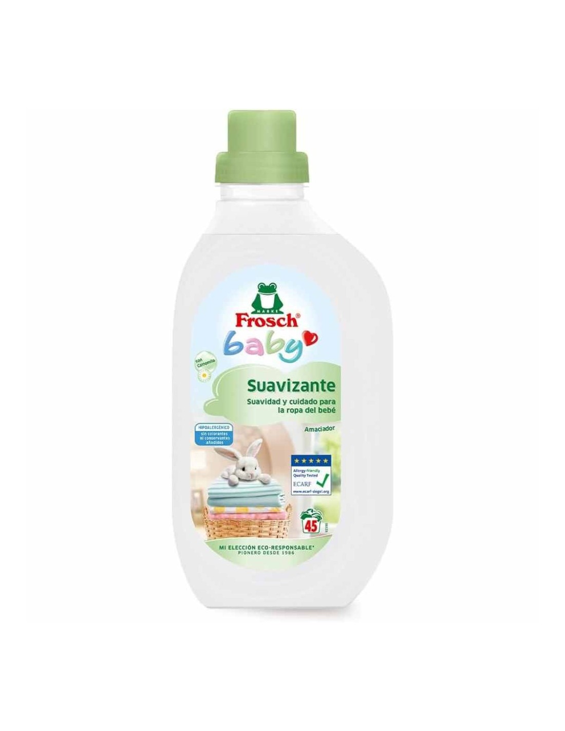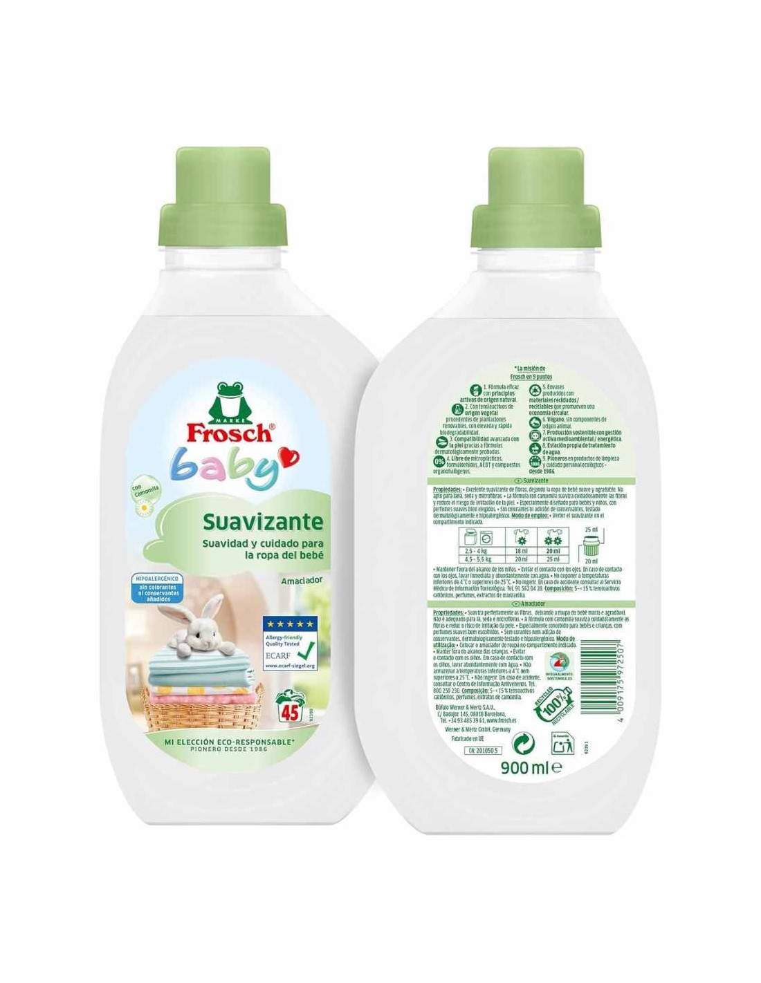 El Suavizante Frosch Baby ha sido desarrollado para ofrecer una suavidad duradera en la ropa de toda la familia, con especial cuidado en las prendas de bebé. Su fórmula hipoalergénica, sin colorantes ni fragancias fuertes, está dermatológicamente testada y protege la piel sensible, evitando irritaciones. Además, contiene ingredientes de origen natural y biodegradables, respetando tanto los tejidos como el medioambiente. El envase de 900 ml rinde hasta 45 lavados, aportando suavidad, frescor y un cuidado delicado a cada colada