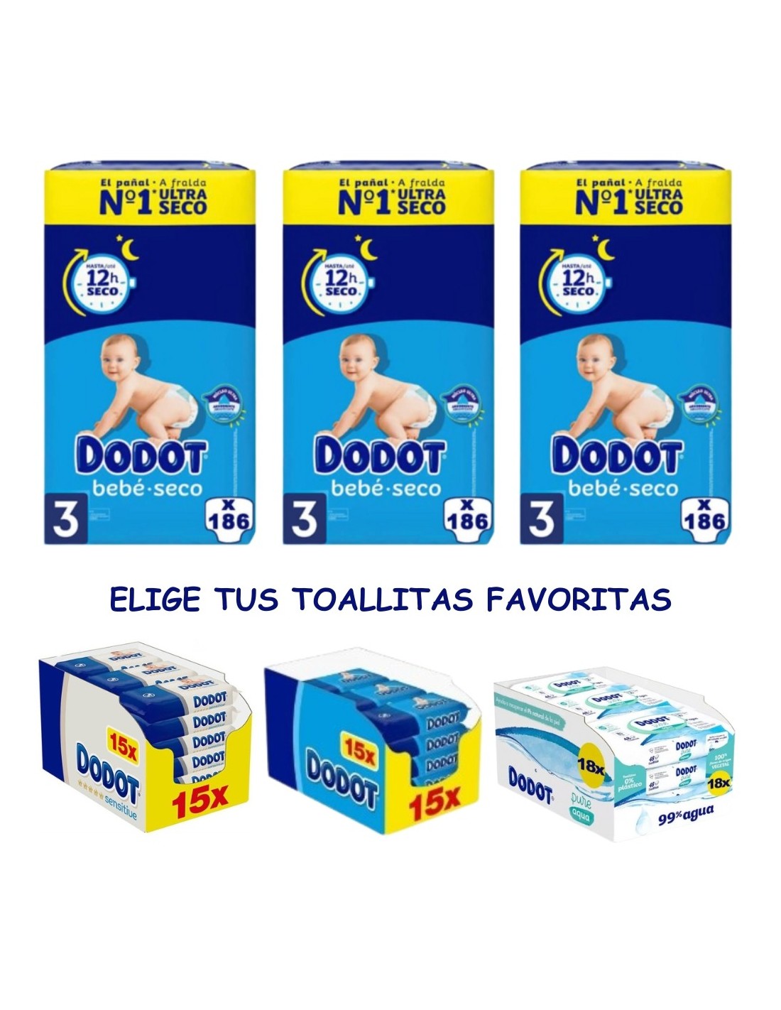 3 cajas de 186 pañales Bebé-Seco (558 uds.) + Toallitas Dodot a elegir.