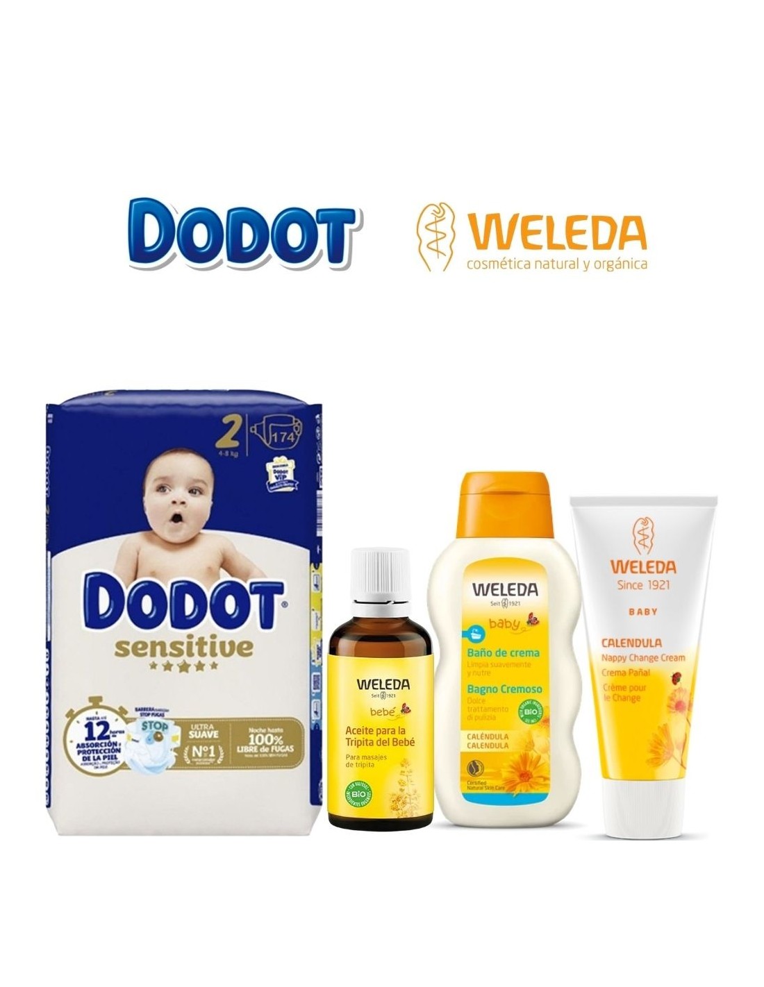 Pack bebé que combina pañales Dodot talla 2 (174 unidades) con una selección de productos Weleda para el cuidado diario del bebé, pensado para cubrir las necesidades de higiene y protección de la piel en los primeros meses.