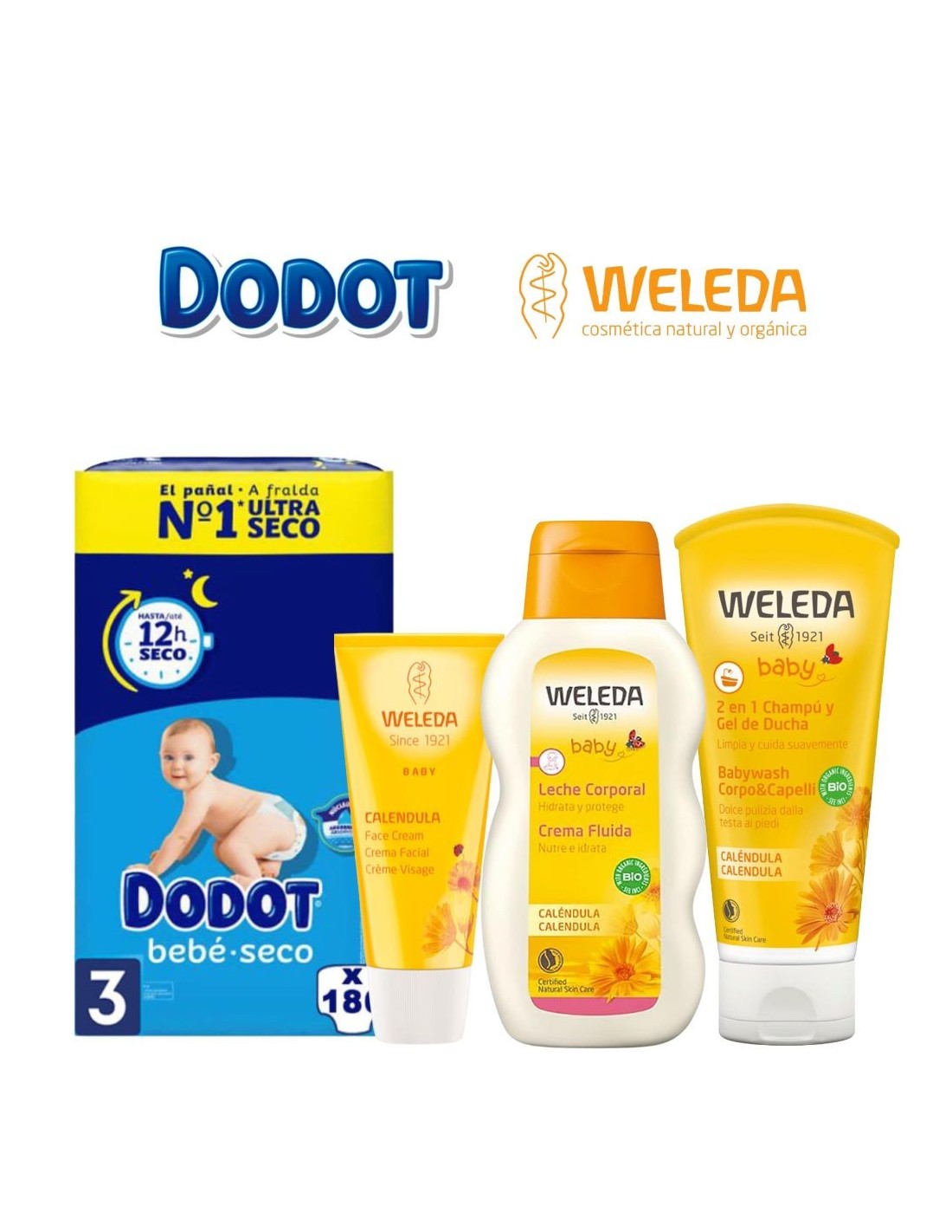 Incluye una caja de pañales Dodot Bebé-Seco talla 3, indicados para bebés de 6 a 10 kg, que ayudan a mantener la piel seca durante más tiempo gracias a su capacidad de absorción, junto a una cuidada selección de productos Weleda, formulados con ingredientes de origen natural para la higiene diaria y el cuidado de la piel sensible del bebé.