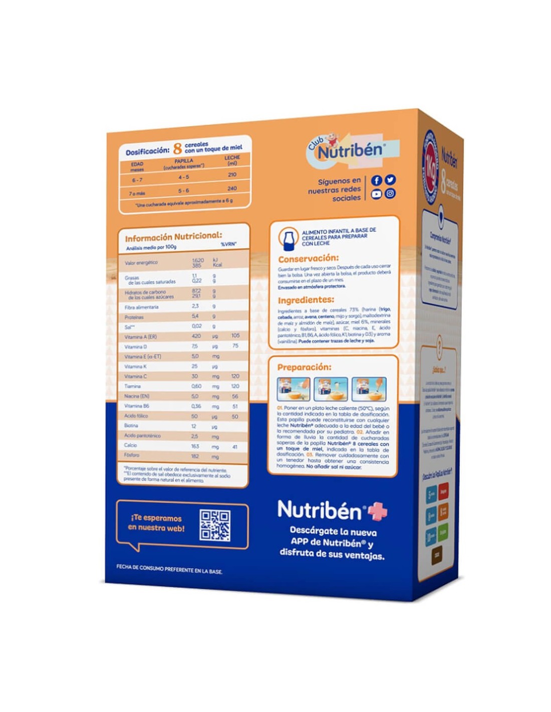 La Papilla Nutribén 8 Cereales con Miel está elaborada con una mezcla equilibrada de ocho cereales seleccionados (trigo, maíz, arroz, cebada, avena, centeno, mijo y sorgo) y un toque natural de miel, que aporta dulzura y energía al bebé.
