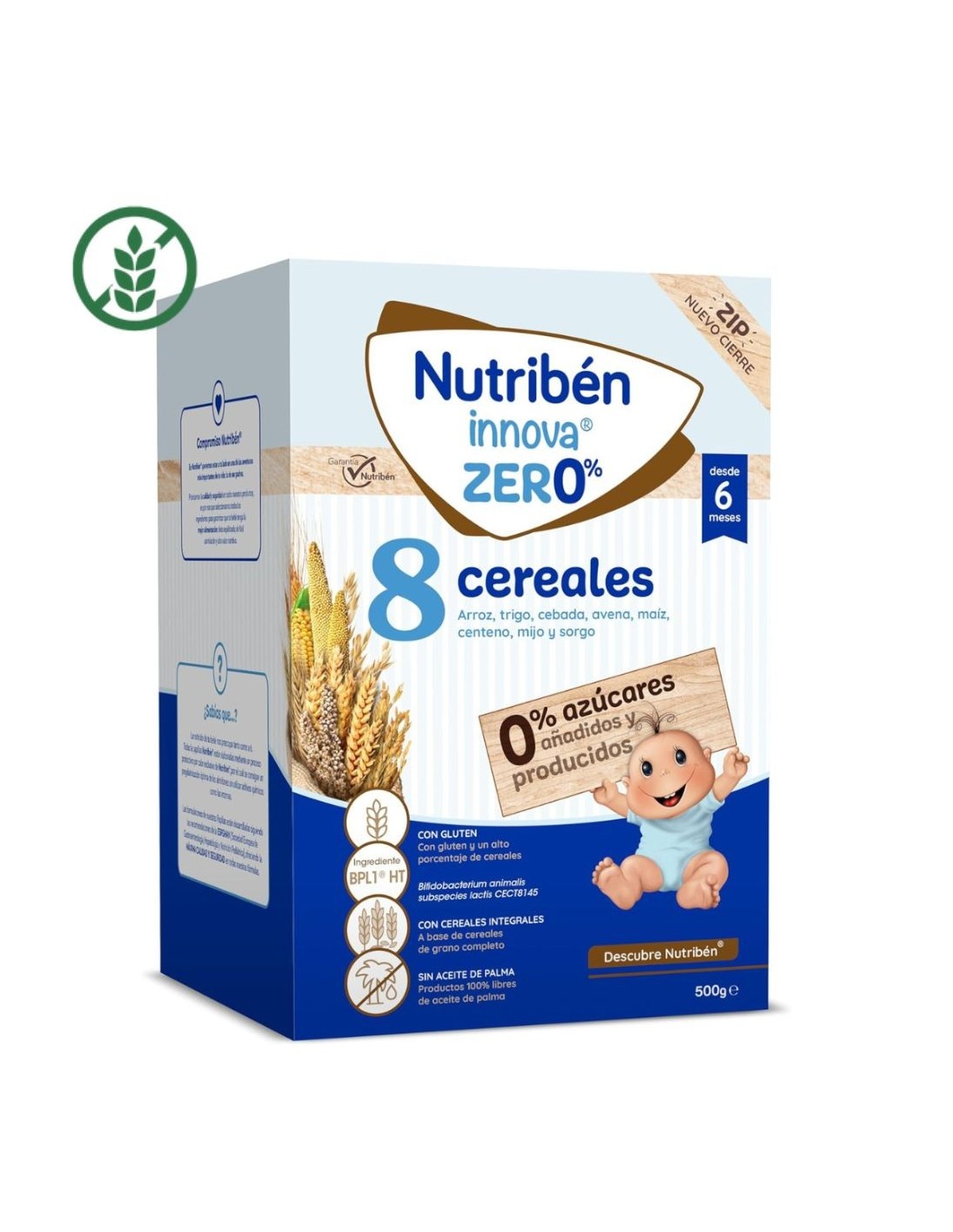 La Papilla Nutribén Innova 8 Cereales 0,0 está elaborada con una cuidadosa selección de cereales (trigo, maíz, arroz, cebada, avena, centeno, mijo y sorgo), sin procesos químicos ni azúcares añadidos, para ofrecer al bebé una nutrición saludable, equilibrada y natural. Su fórmula 0,0 significa que no contiene aceite de palma ni azúcares añadidos, manteniendo el sabor auténtico del cereal. Gracias a su proceso de elaboración mediante Natural Process, conserva los nutrientes originales de los cereales, resultando más digerible y con una textura suave y cremosa. Aporta hidratos de carbono complejos, hierro, calcio, zinc y 13 vitaminas que favorecen el crecimiento físico y el desarrollo del sistema inmunitario y cognitivo. Ideal para preparar con leche materna o de fórmula, tanto para desayuno como merienda.