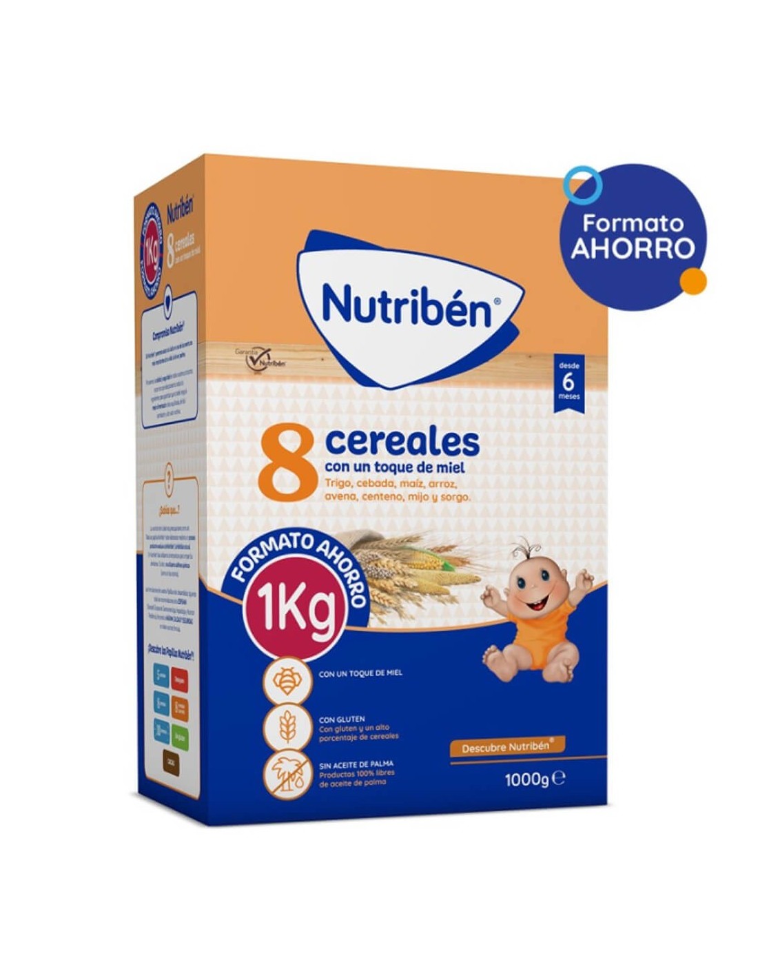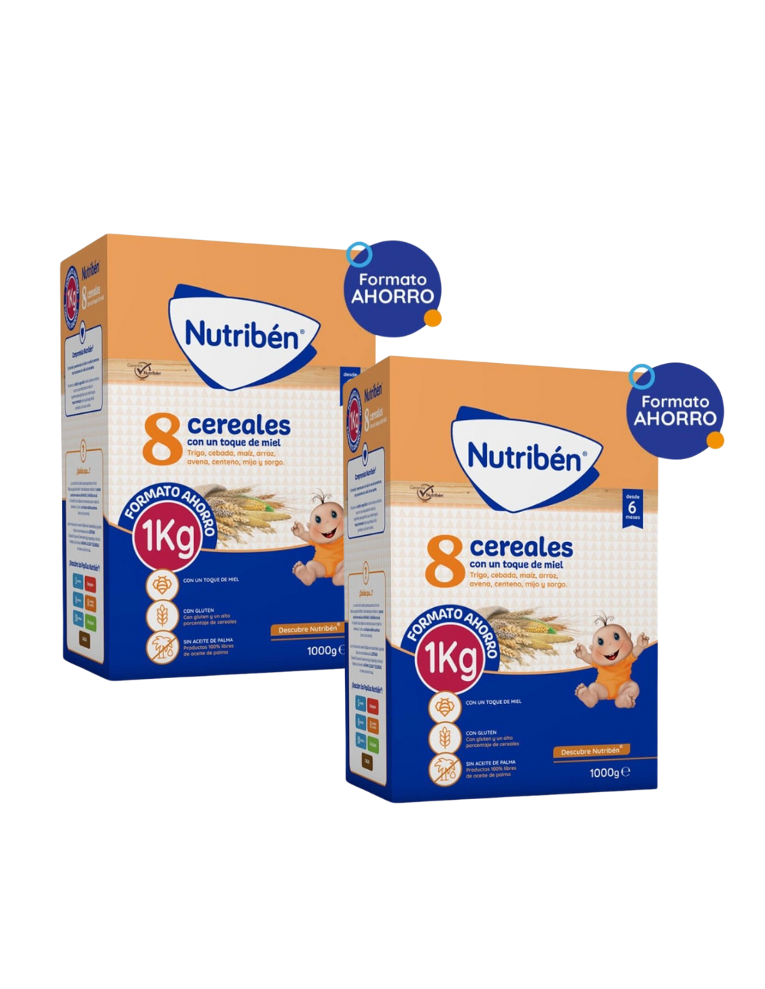 La Papilla Nutribén 8 Cereales con Miel está elaborada con una mezcla equilibrada de ocho cereales seleccionados (trigo, maíz, arroz, cebada, avena, centeno, mijo y sorgo) y un toque natural de miel, que aporta dulzura y energía al bebé.