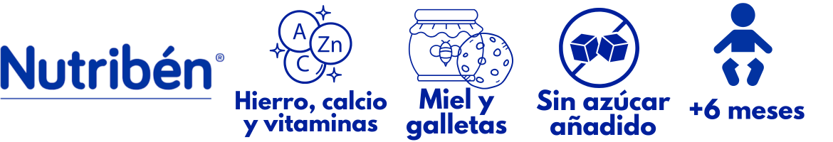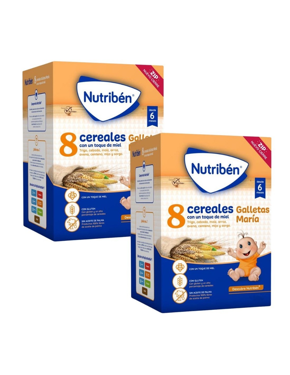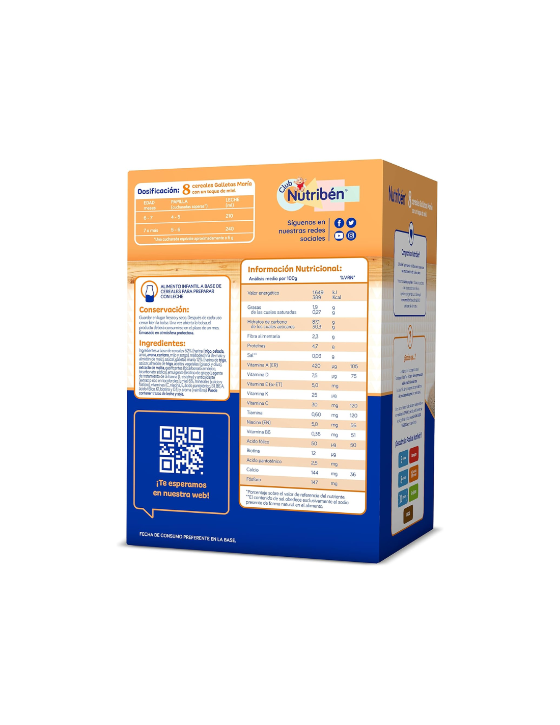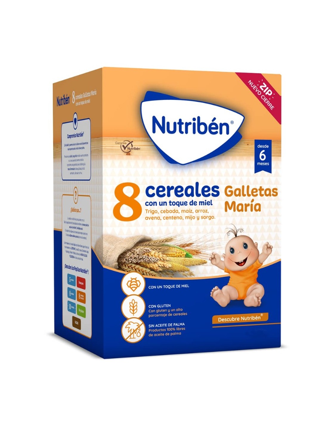 La Papilla Nutribén 8 Cereales Miel y Galletas María está elaborada con una mezcla equilibrada de ocho cereales naturales (trigo, maíz, arroz, cebada, avena, centeno, mijo y sorgo), enriquecida con miel natural y el sabor clásico de las galletas María.