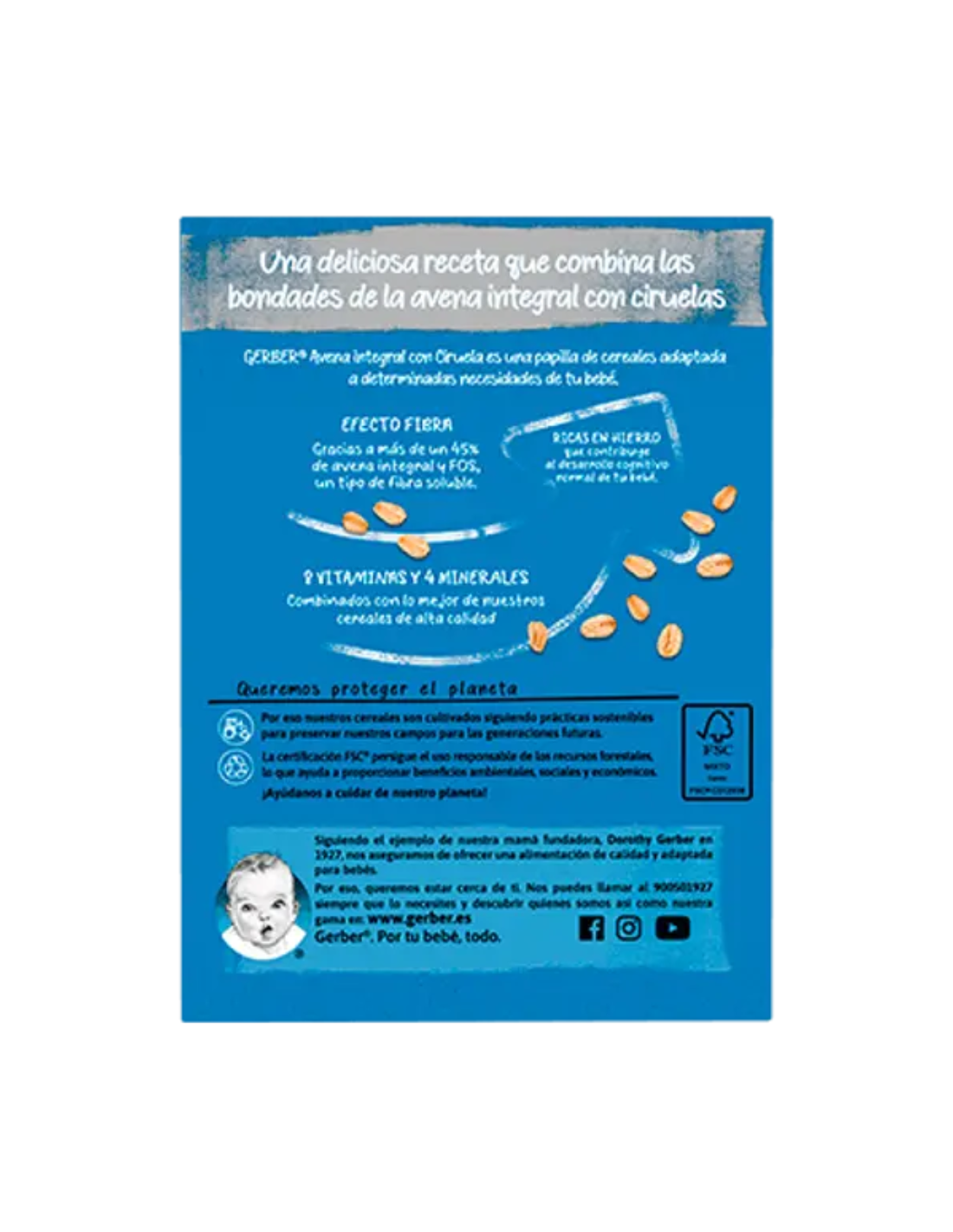 La Papilla de Avena Integral con Ciruela Gerber es una opción excelente para introducir los cereales en la alimentación del bebé. Su combinación de avena integral y ciruela no solo aporta un sabor delicioso, sino que también ayuda a regular el tránsito intestinal , gracias a su contenido en fibra soluble e insoluble. Además, está elaborada con cereales de cultivos sostenibles , garantizando una alimentación responsable y saludable. Su textura suave y de fácil disolución permite una preparación sencilla, ideal para mezclar con leche o agua según las preferencias del bebé. Esta papilla está libre de azúcares añadidos, asegurando un alimento natural y nutritivo sin ingredientes innecesarios. Su envase cuenta con la certificación FSC , lo que indica que proviene de fuentes responsables, contribuyendo así a la preservación del medio ambiente.