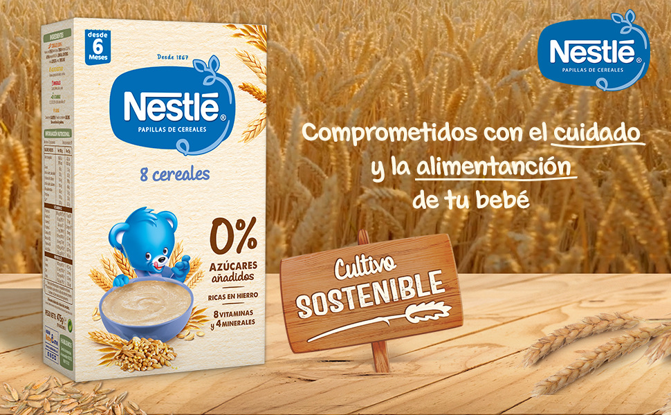 La Papilla de 8 Cereales de Nestlé está elaborada con trigo, avena, cebada, maíz, centeno, arroz, mijo y sorgo, ofreciendo una fuente natural de energía para el crecimiento del bebé. Su fórmula enriquecida con hierro, un mineral clave para el desarrollo cerebral, se complementa con zinc y vitaminas que fortalecen las defensas naturales. No contiene azúcares añadidos, manteniendo un perfil nutricional saludable para el bebé. Gracias a su textura fina, se disuelve fácilmente en leche templada, lo que facilita su preparación y asegura una alimentación práctica y deliciosa para el día a día.